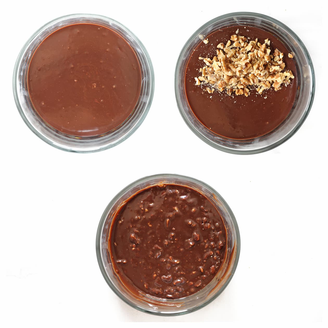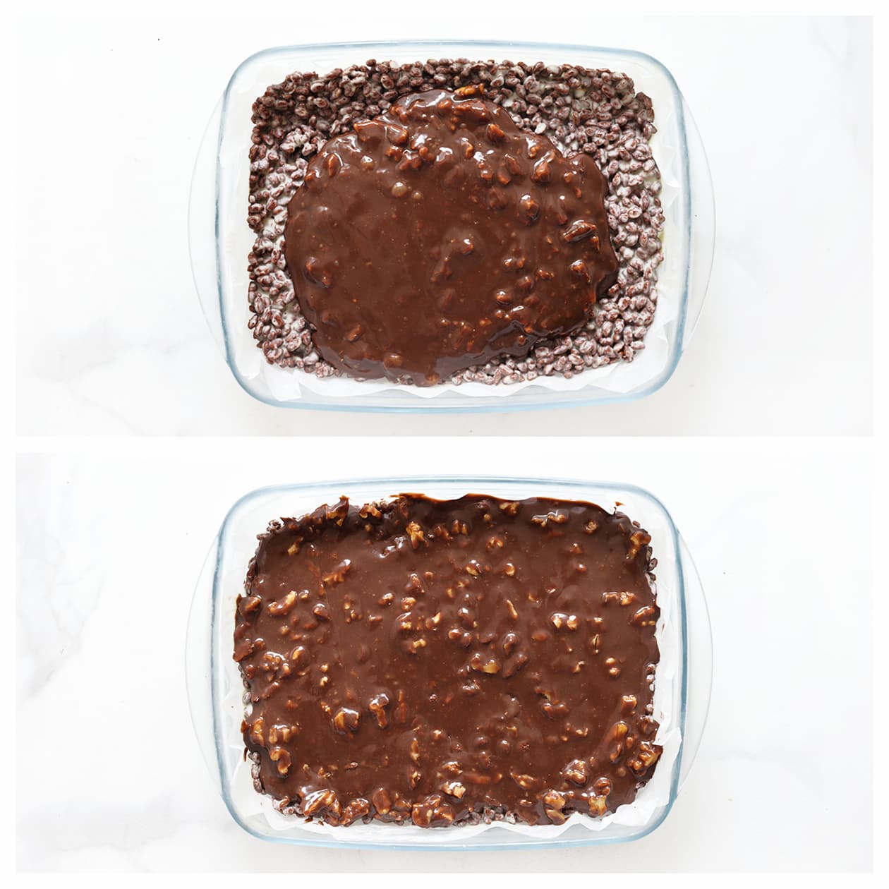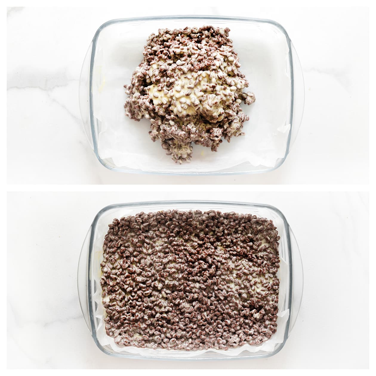 Press the first layer down firmly with the back of a spoon or spatula. The more compact, the neater the pieces will cut later.