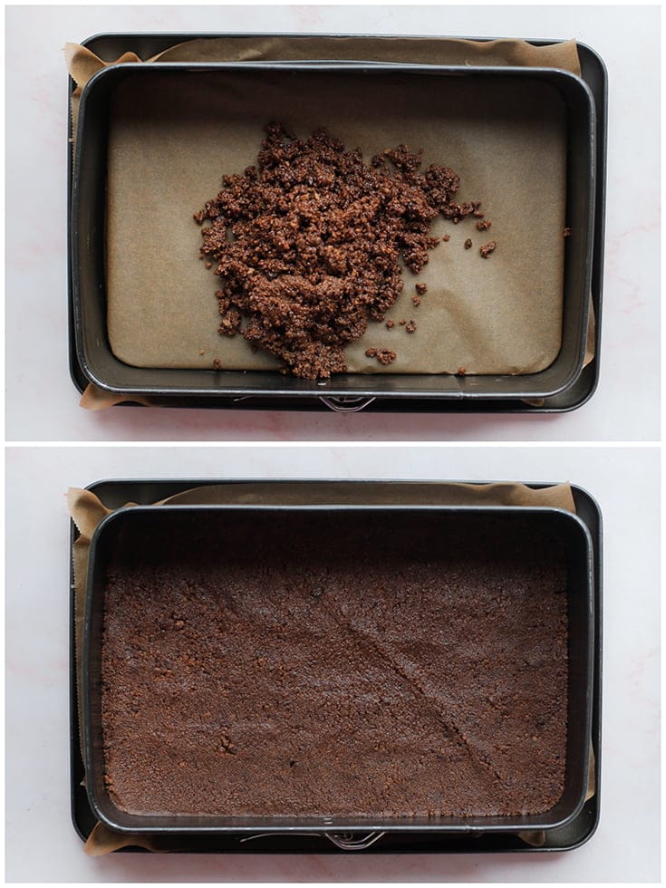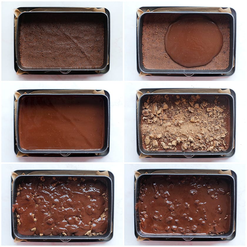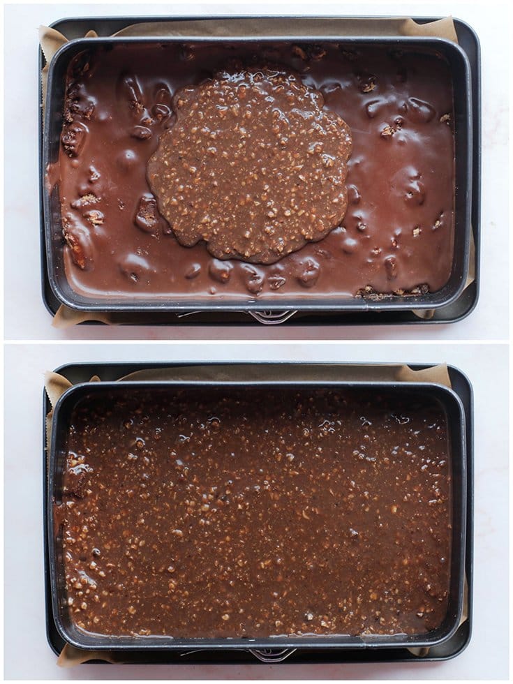 Voeg de hazelnotenganache over de chocoladelaag en smeer deze goed uit. Leg, afgedekt, in de vriezer tot het stevig is.
