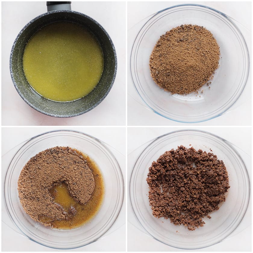 Doe de fijngemalen chocolate chip cookies in een diepe kom en voeg de gesmolten roomboter toe. Meng goed.
