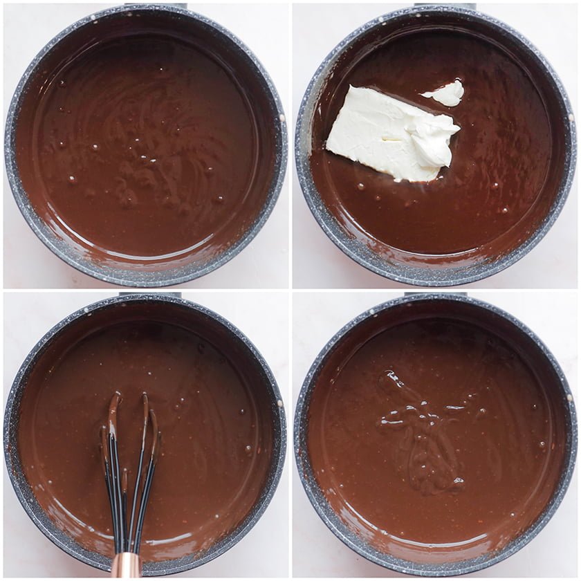 Breng de ongeklopte slagroom (200 ml) in een steelpan tot tegen de kook aan. Haal de steelpan van het vuur en voeg de stukgemaakte pure chocolade toe (250 g). Laat een minuut staan. Na een minuut roer je deze tot een gladde massa.