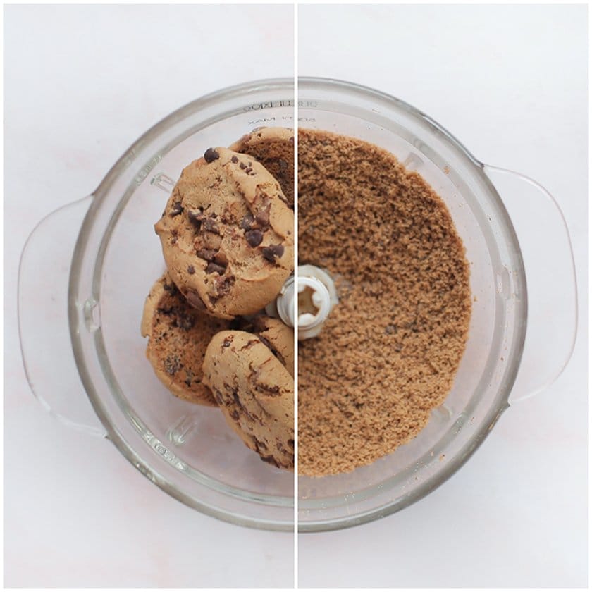Doe de chocolate chip cookies (150 g) in een hakmolen. Maal de koekjes fijn.