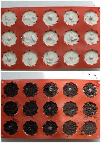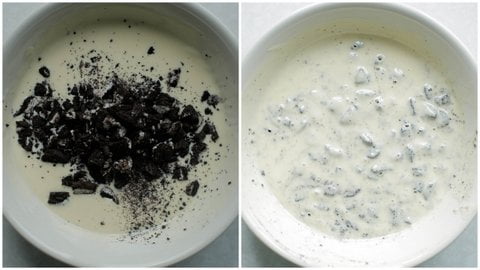 Hak 35 gr oreo niet al te fijn. De overige 35 gr oreo maal je wel fijn. |