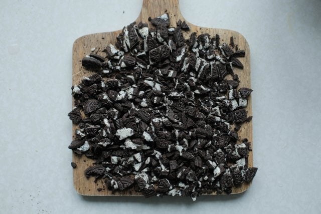 Breek de eieren boven de kom. Voeg de donkerbruine basterdsuiker, vanillesuiker en het zout toe. Mix een minuut. Voeg de zonnebloemolie en het water toe, mix een minuut. Zeef het cacao-mengsel boven de kom. Mix tot goed een gladde massa. Leg de mixer weg en gebruik vanaf nu de spatel. Voeg de stukjes oreo toe en spatel goed samen. |