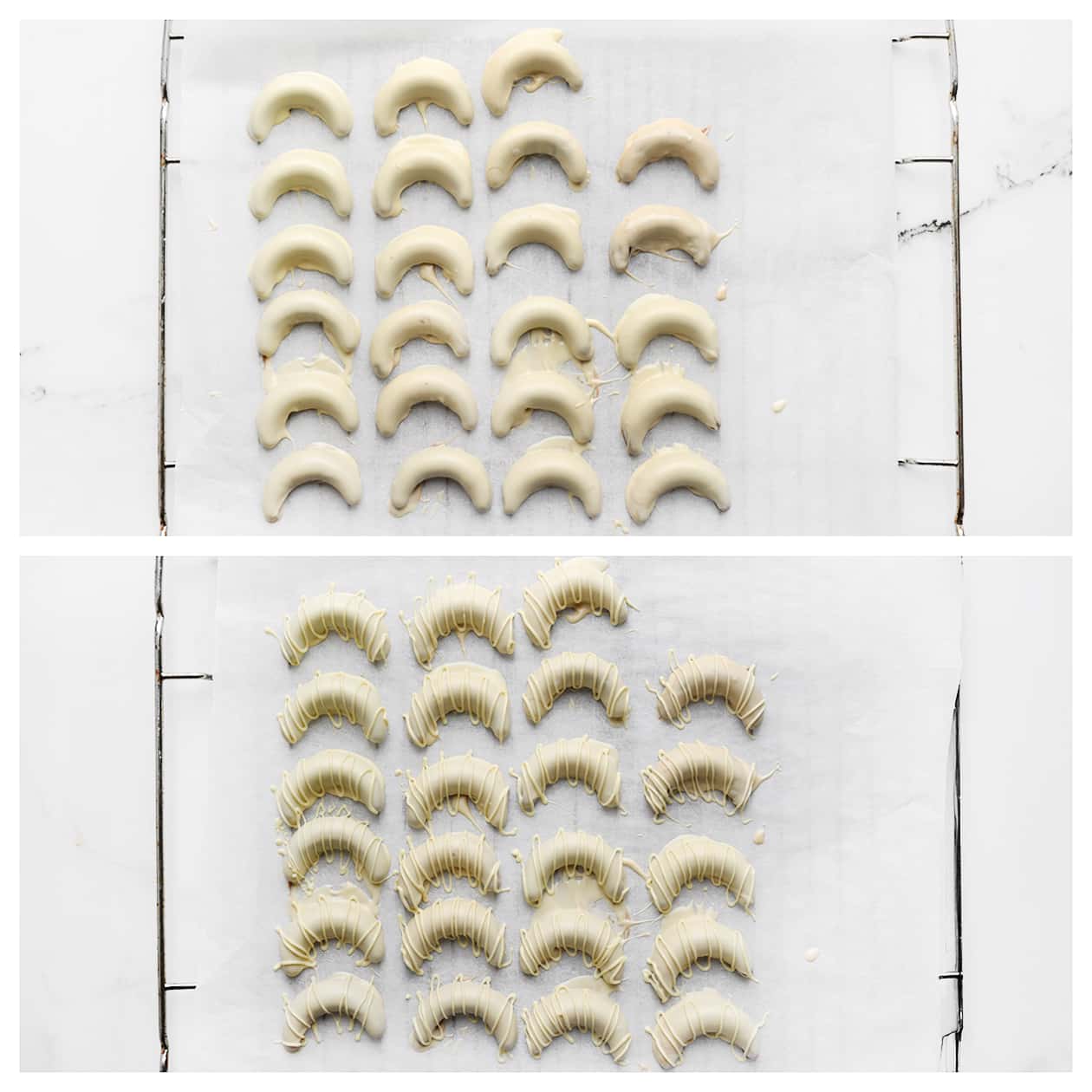 Store the cones in an airtight container in a cool place, but not in the refrigerator if you want to maintain the chocolate’s shine. In a cool, dry environment, they will stay crisp and beautiful.