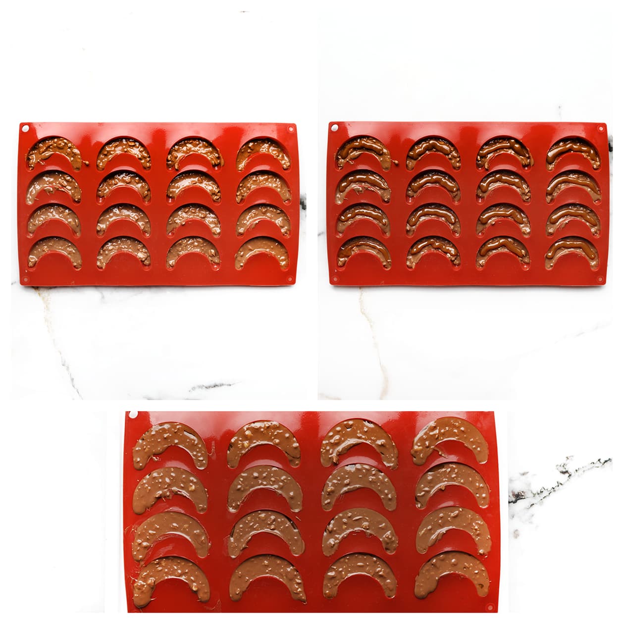 Putting the silicone mold in the refrigerator (or briefly in the freezer) can speed up the hardening of the chocolate-peanut mixture. However, don’t leave it in the freezer too long, as temperature changes can cause the chocolate to develop white streaks.
