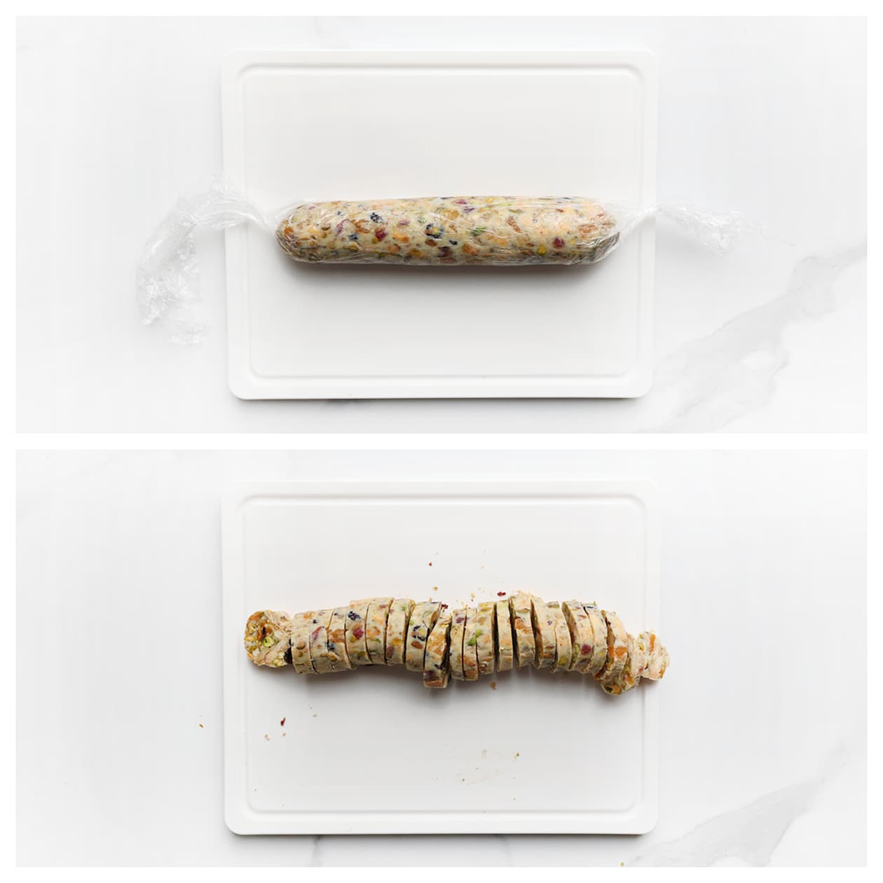 Make sure to roll the plastic wrap tightly around the dough. This helps create a neat cylindrical shape and makes slicing easier.