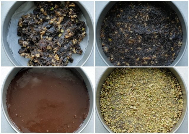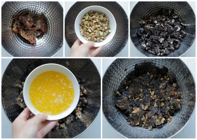 Maal de walnoten en amandelen niet al te fijn in een hakmolen. |