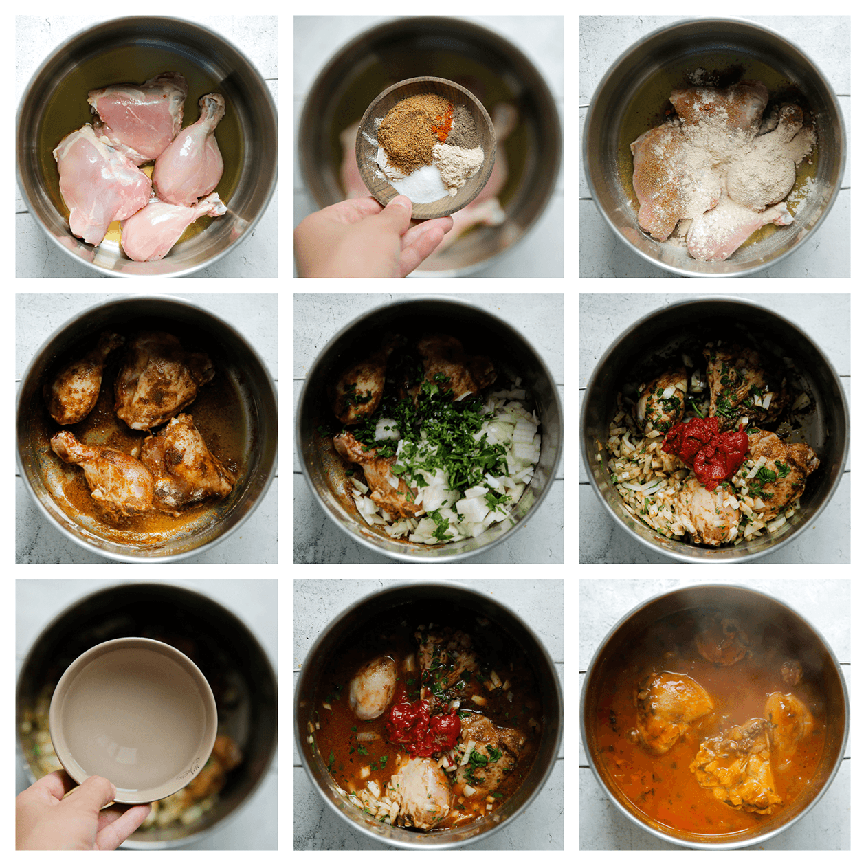 Verhit de olijfolie in een koekenpan op middelhoog vuur. Voeg de stukken kip, het zout, knoflookpoeder, komijnpoeder, zwarte peper, cayennepeper en uienpoeder toe. Bak 2 minuten. Voeg de gele ui en peterselie toe. Bak 3 minuten. Voeg het water (900 ml) en de tomatenpuree toe. Breng aan de kook. Zet het vuur vervolgens laag en kook, afgedekt, 20 minuten. |