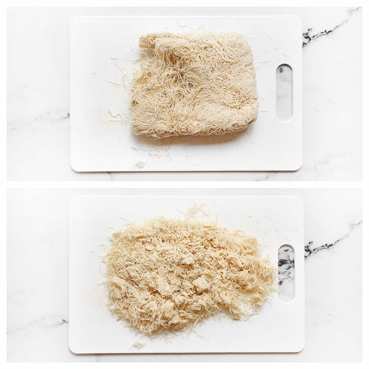 Gebruik kadayif van goede kwaliteit zodat het lekker knapperig blijft.