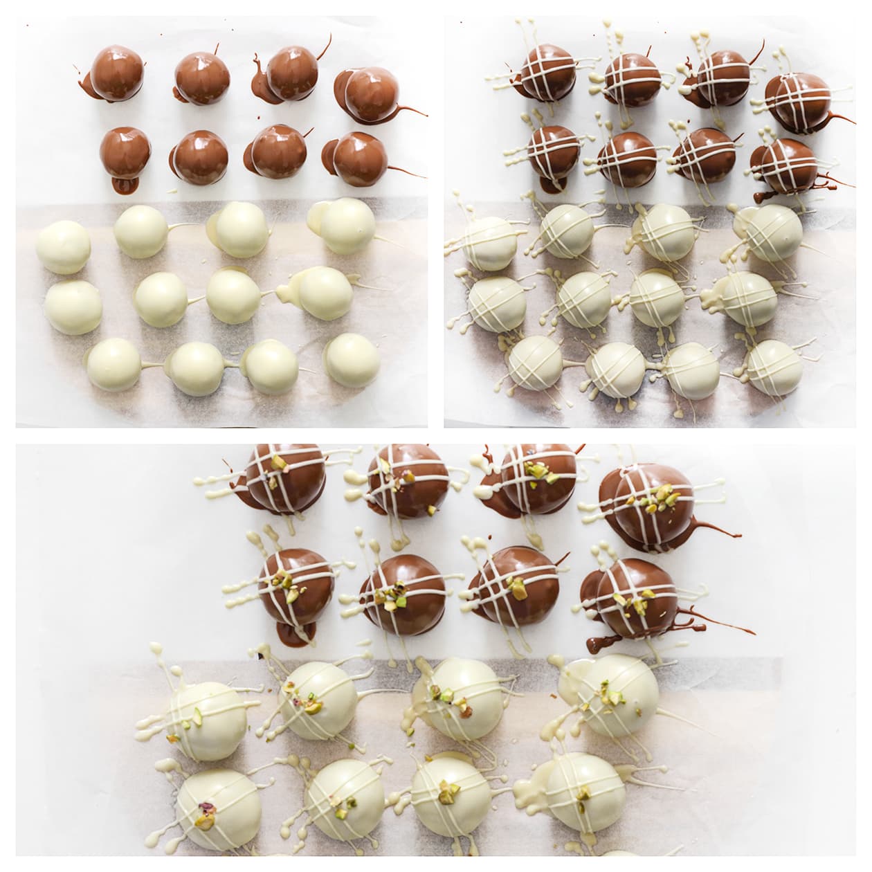 Leg de balletjes direct op bakpapier na het dompelen in chocolade om te voorkomen dat ze vastplakken.