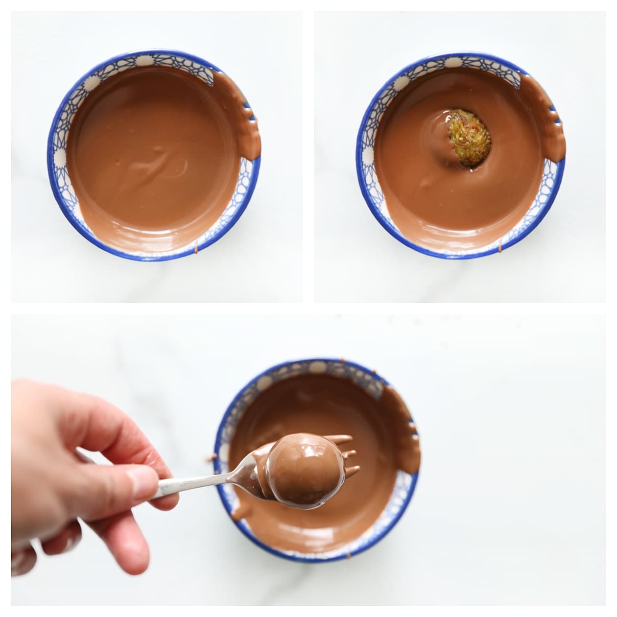 Gebruik een vork om de balletjes in de chocolade te dippen.