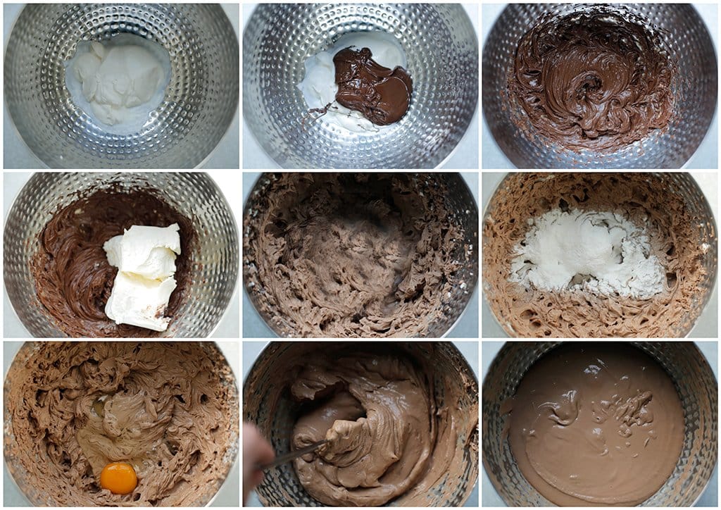 Doe de roomkaas (200 gr) in een diepe kom (gebruik roomkaas op kamertemperatuur!). Voeg de gesmolten pure chocolade toe en mix goed. Voeg de suiker, vanillesuiker en de overige roomkaas toe. Mix alles tot een geheel. Voeg de maïzena toe en mix nogmaals. Leg de mixer weg en gebruik vanaf nu een spatel. Los het ei één voor één luchtig op (gebruik geen mixer, want daarmee klop je het beslag op en verdwijnt de luchtigheid). |