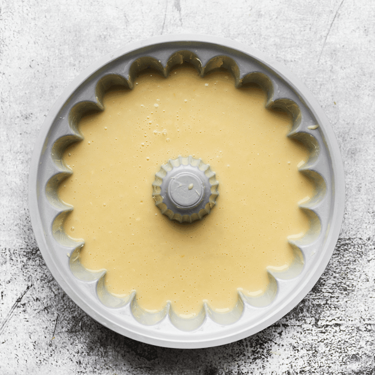 Thoroughly grease your bundt pan and optionally dust it with flour to prevent the cake from sticking. Use butter or baking spray for greasing.
