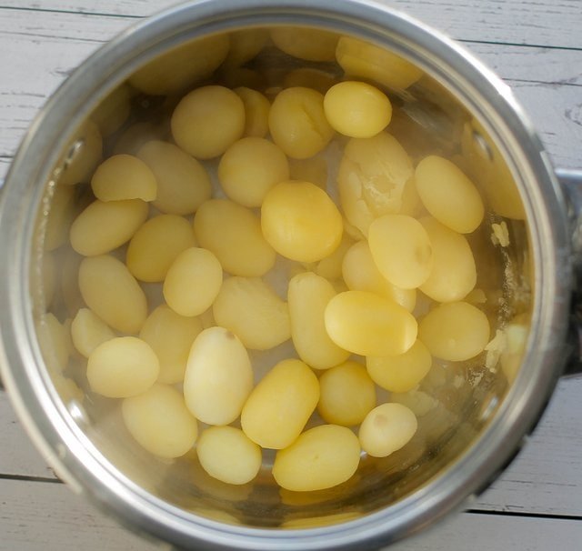 Schil en snijd de aardappelen. Breng ruim water in een pan aan de kook. Voeg de aardappelen toe en kook ze gaar in ca. 15-20 minuten. Laat het water uitlekken en de aardappels afkoelen. |
