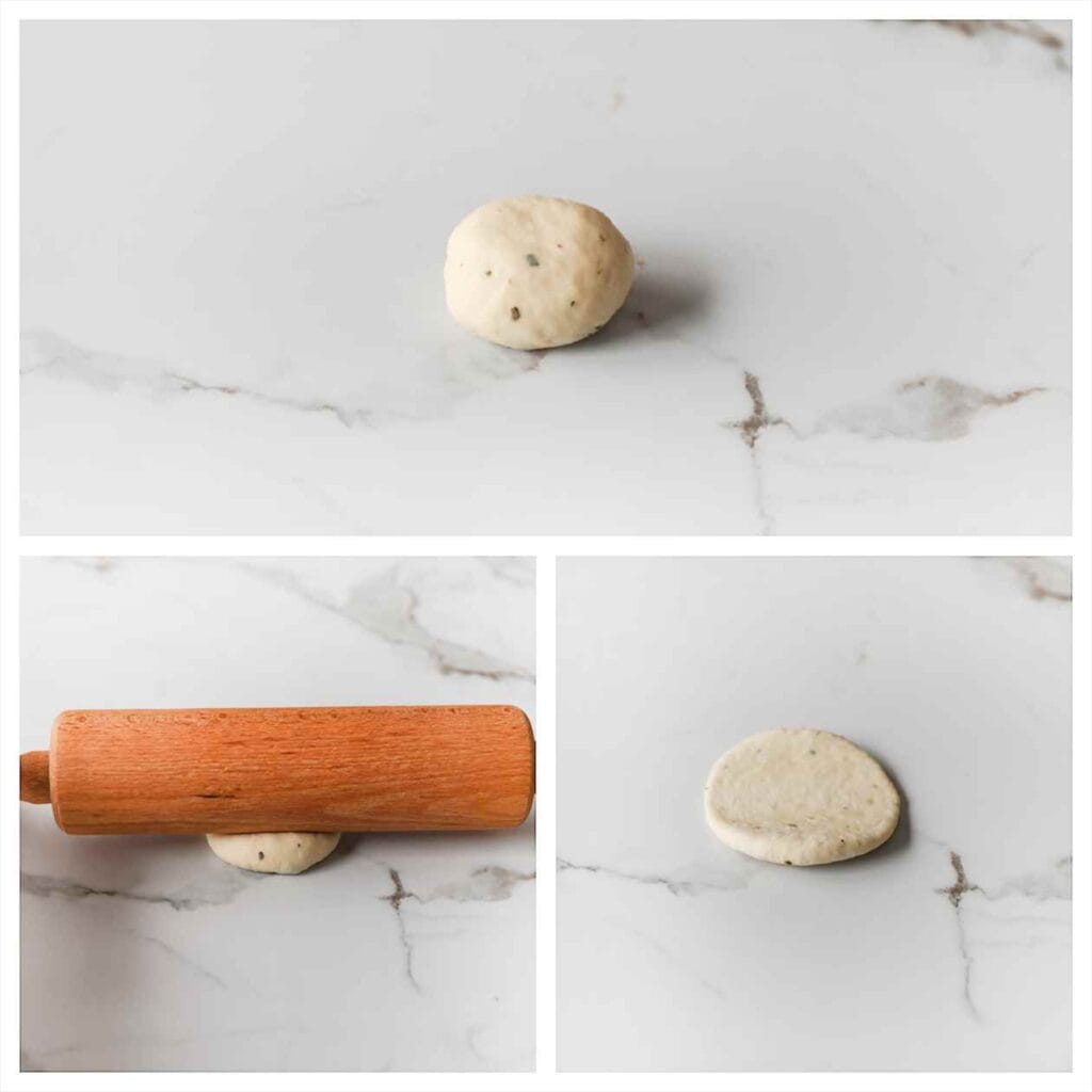 Take a ball of dough and roll it out into a circle (about 9 cm). Repeat the process.