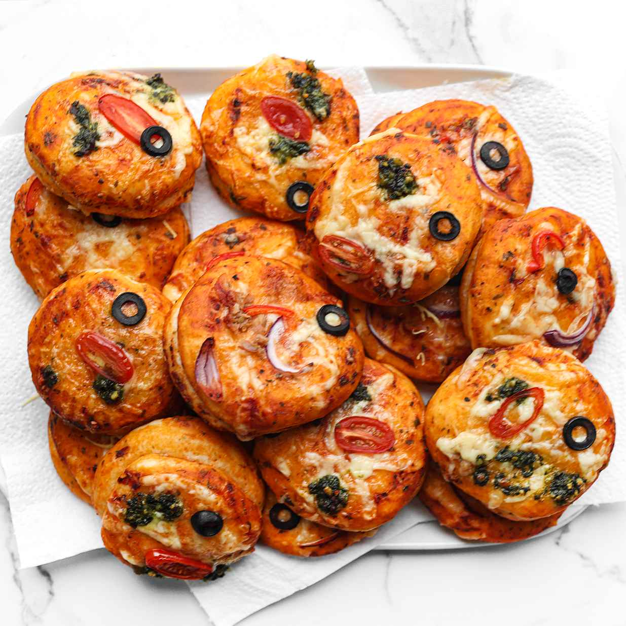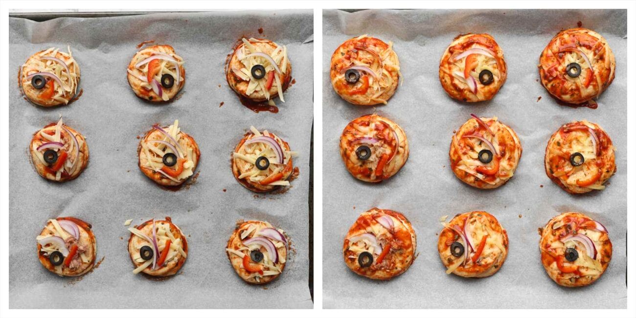 Bake the pizza bread in a preheated oven at 200°C (390°F) for 10 – 15 minutes, or until golden brown. Once out of the oven, immediately cover the bread with a tea towel to keep them soft.