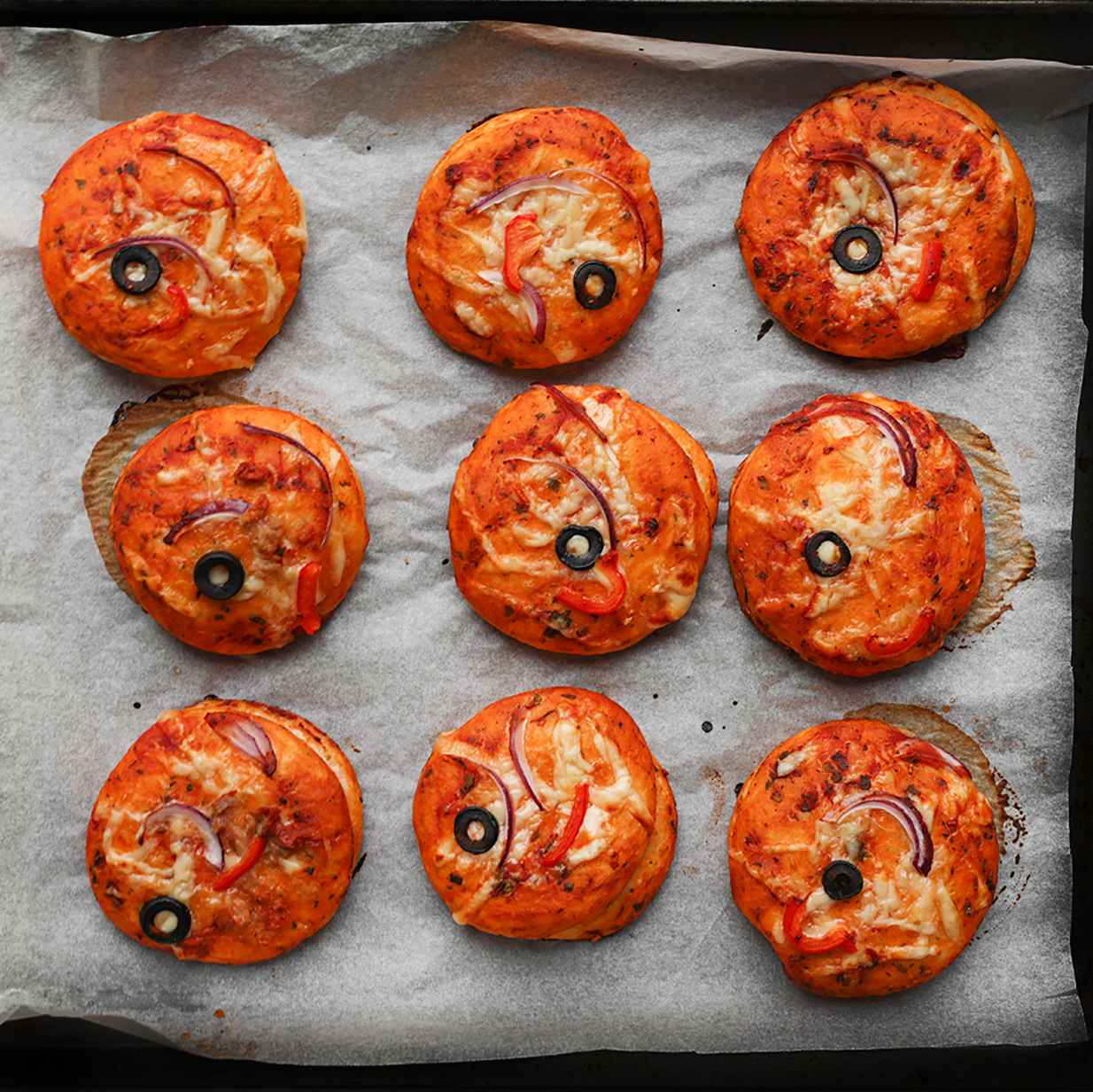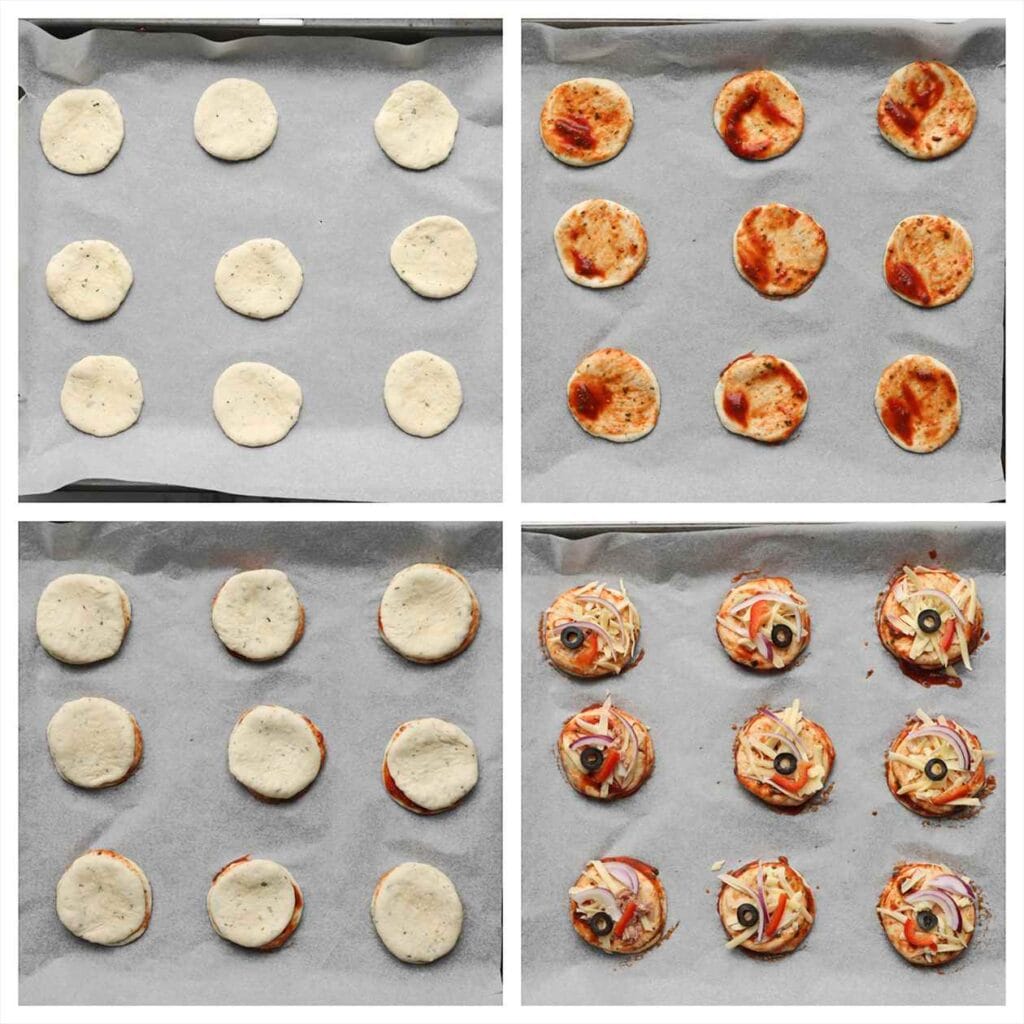Place the dough on a baking tray lined with parchment paper. Spread a thin layer of tomato sauce on it and place another piece of dough on top. Again, spread tomato sauce and garnish with grated cheese, red onion, olives, and bell pepper (you can customize the toppings as you like).