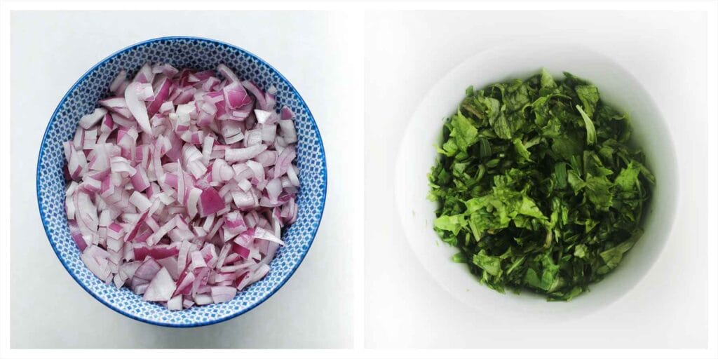 Peel and finely chop the red onion. Finely chop the arugula.