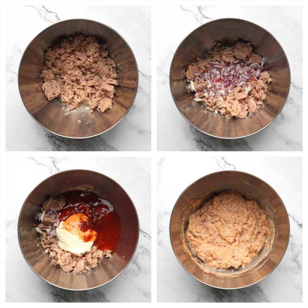 Place the canned tuna in a large bowl. Add the red onion, mayonnaise, chili sauce, and sambal. Mix well.