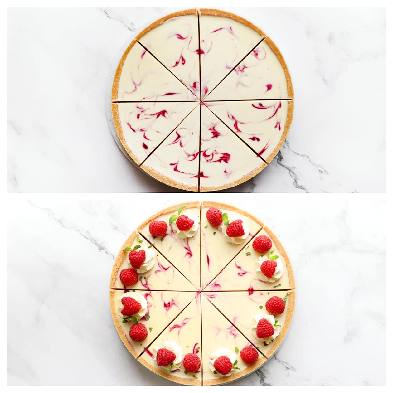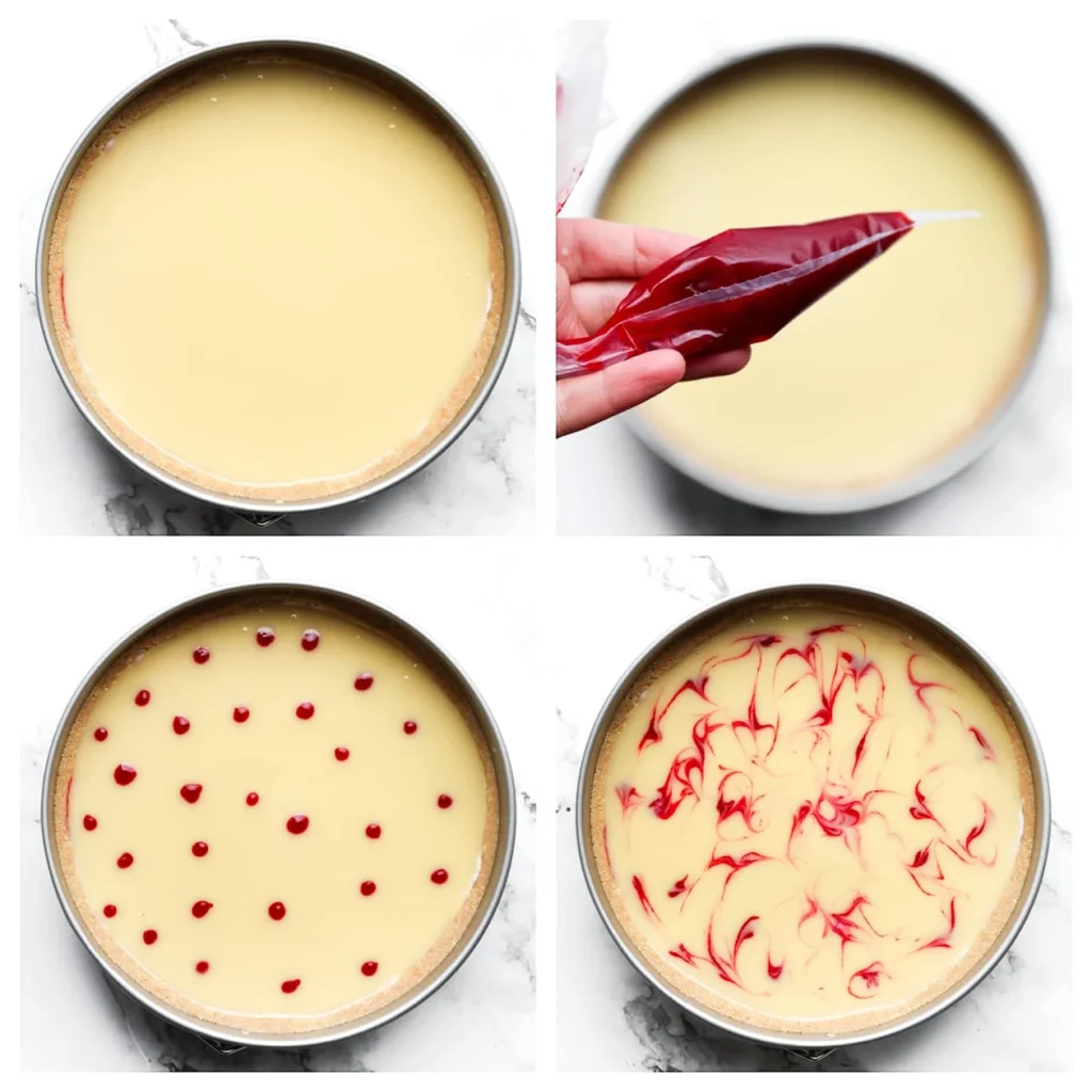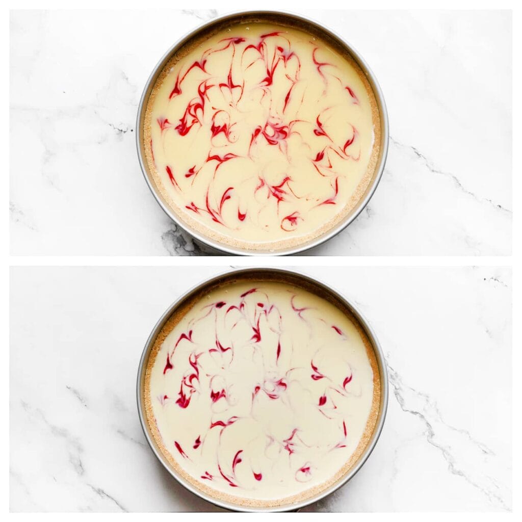 Verdeel het witte cheesecakemengsel gelijkmatig over de bakvorm. Houd een beetje van het witte cheesecakemengsel apart voor de garnering en doe deze in een spuitzak met een spuitmondje (bewaar in de koelkast). Spuit wat frambozensiroop over het witte cheesecakemengsel en verdeel het frambozenmengsel gelijkmatig erover.
