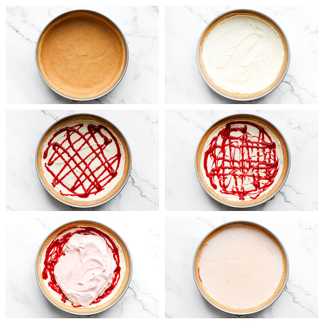 Verdeel de lagen cheesecakevulling en frambozensiroop gelijkmatig.