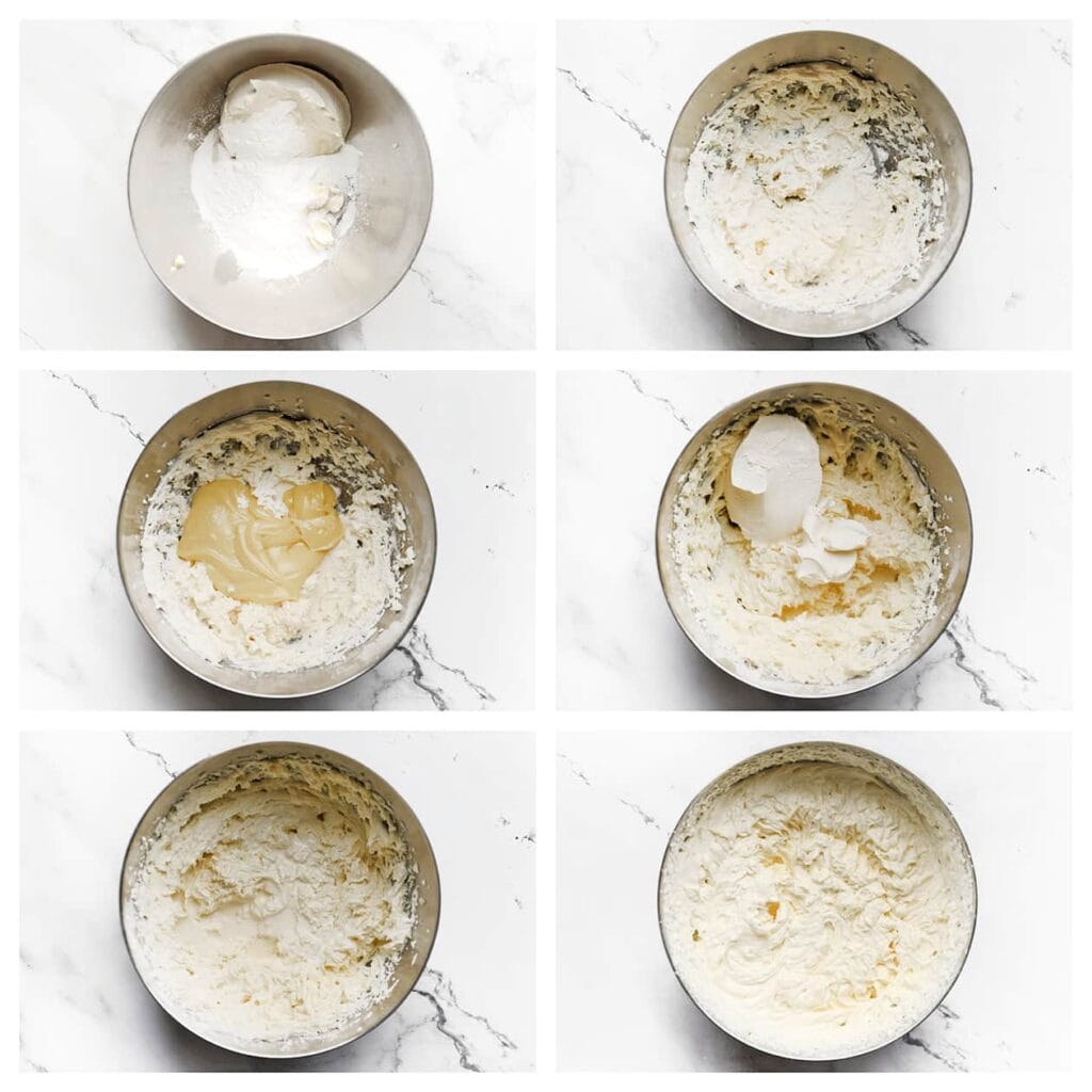 Zorg ervoor dat de mascarpone, roomkaas en gesmolten witte chocolade op kamertemperatuur zijn voordat je ze mengt. Dit zorgt voor een gladder en gelijkmatiger mengsel. Voeg en mix de koude ongeklopte slagroom beetje bij beetje toe totdat de room stijve pieken vertoont.