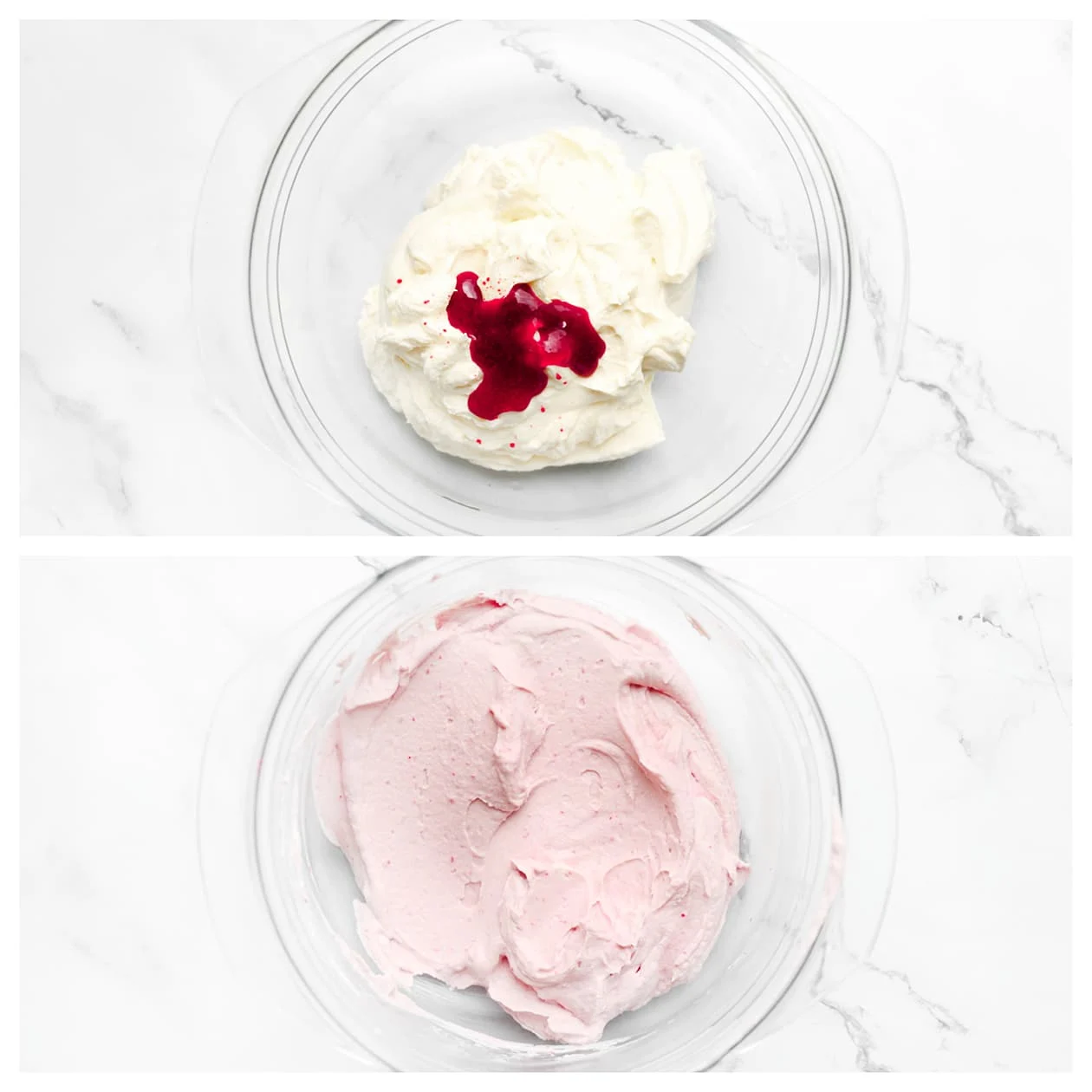 Voeg aan een van de kommen met cheesecakemengsel wat van de frambozensiroop toe. Ik heb 35 gram gebruikt, maar je kunt ook meer toevoegen naar smaak.