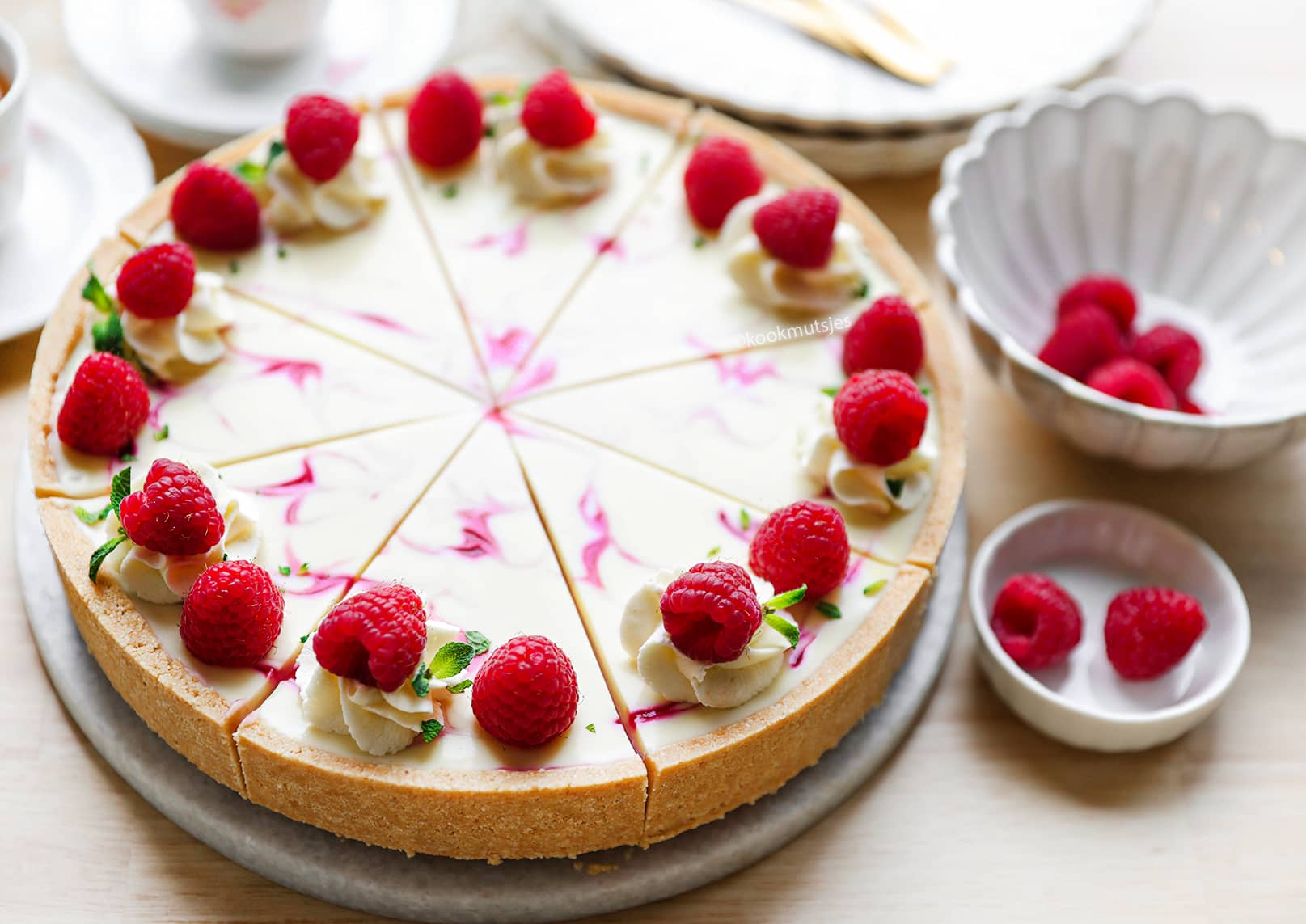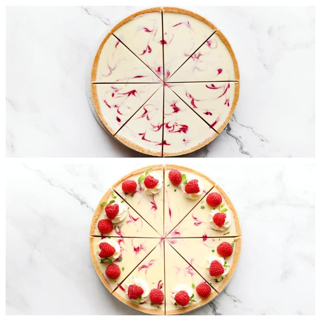 Snijd de frambozencheesecake in gelijke puntjes. Indien gewenst, garneer met een toefje room, verse frambozen en muntblaadjes. Bismillah, geniet ervan!