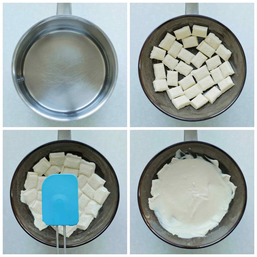 Smelt 150 gram witte chocolade au bain-marie en laat deze volledig op kamertemperatuur komen.