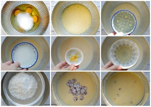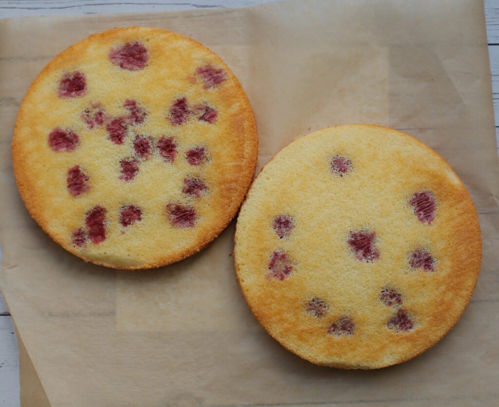 Neem 2 bakvormen met dezelfde formaat. Vet de bakvormen goed in en leg er een vel bakpapier op. Deel het beslag door twee (475 gram beslag per bakvorm). Voeg het beslag toe. Leg de frambozencake in een voorverwarmde oven op 160℃ en bak 25 minuten. Houd de baktijd zelf in de gaten, want elke oven werkt anders. Prik er met een satéprikker in om te kijken of de cake gaar is. Wanneer de prikker er droog uitkomt, is de cake klaar. |