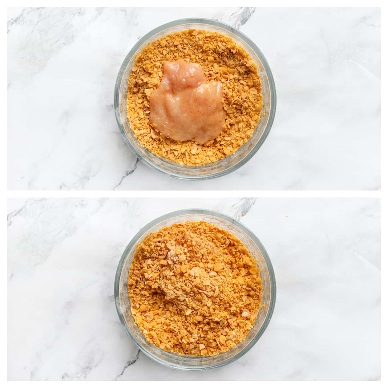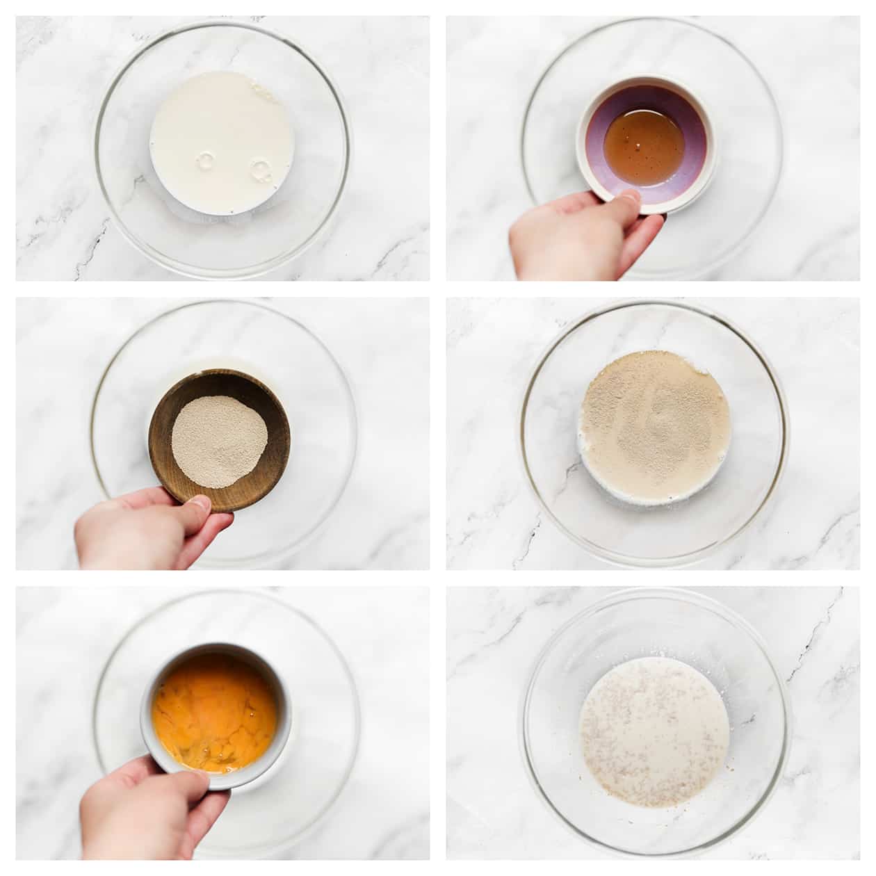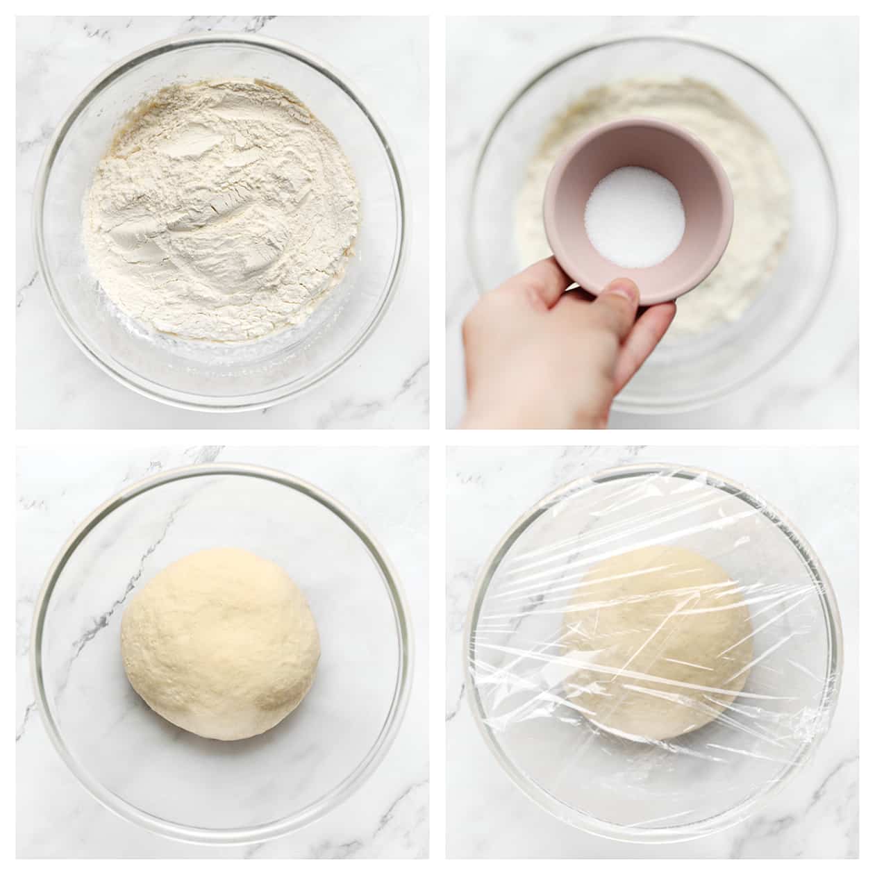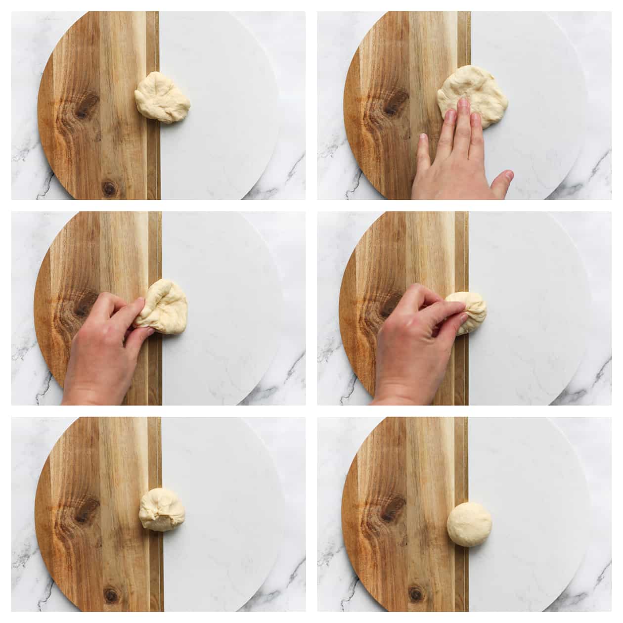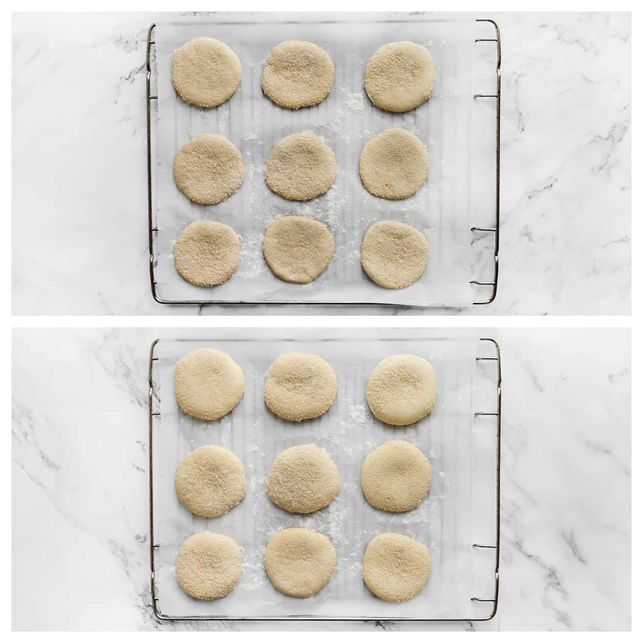 Put some milk in one bowl and sesame seeds in another bowl. Take a piece of dough and first dip the top into the milk and then into the sesame seeds. Make sure not to use too many sesame seeds. Take a piece of dough and place it on your work surface with the sesame seed side down, so that the dough does not stick to the rolling pin. Roll out the dough into a flat circle with a diameter of 10 cm |