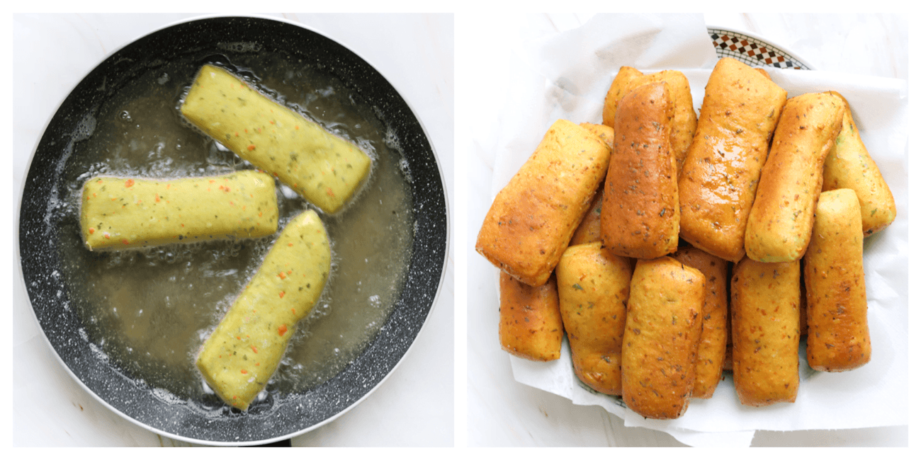 Verhit een laagje zonnebloemolie in een koekenpan op middelhoog vuur (175 °C). Bak de broodjes aan beide kanten in ca. 2-3 minuten mooi goudbruin. Controleer de temperatuur eerst door er een klein stukje deeg in te gooien. Wanneer deze binnen 1 minuut bruin kleurt, is de zonnebloemolie goed op temperatuur. Laat de broodjes uitlekken op keukenpapier. |