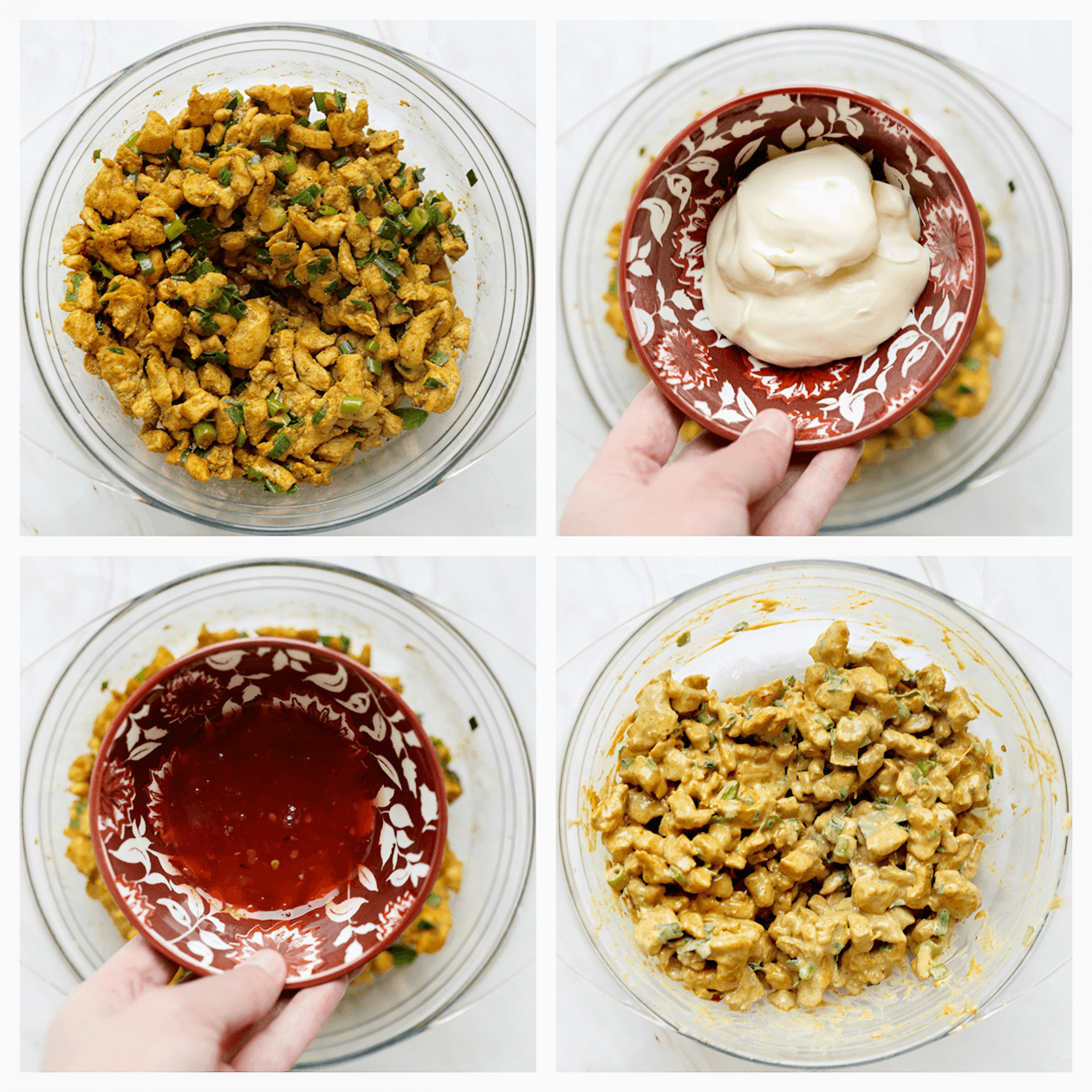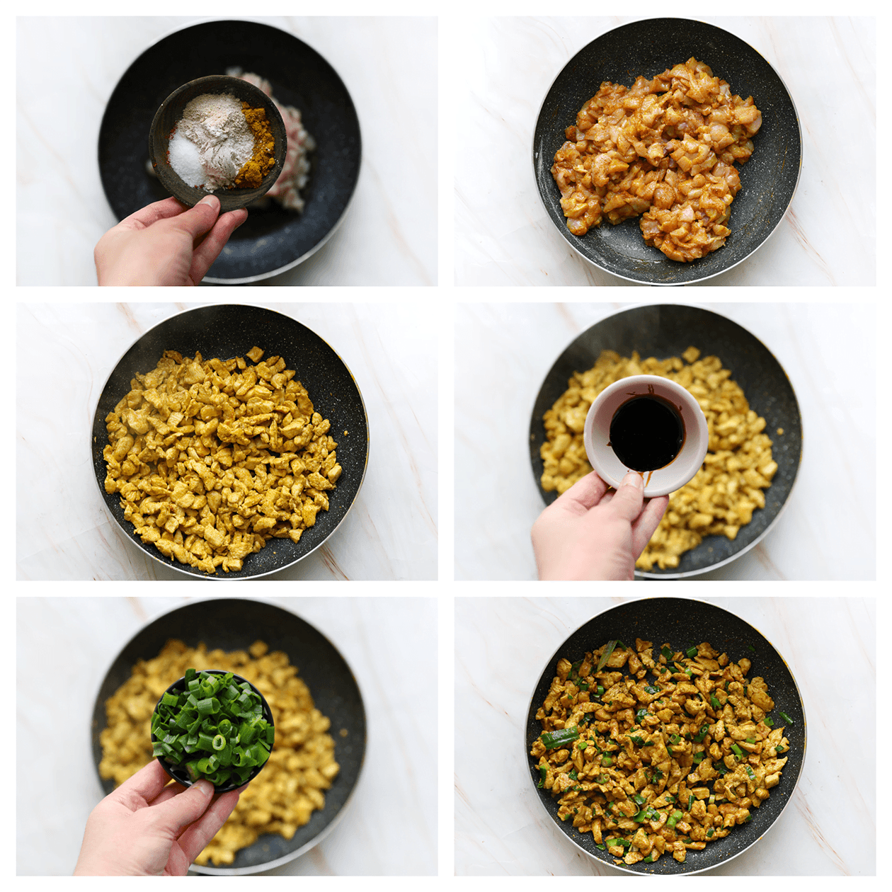 Snijd de kip in kleine blokjes. Verhit de olijfolie in een koekenpan op middelhoog vuur. Voeg de kip, het zout, kerriepoeder, komijnpoeder, de cayennepeper, uienpoeder en knoflookpoeder toe. Bak de kip in ca. 5-6 minuten gaar. Haal de pan van het vuur. Voeg de ketjap manis en lente-ui toe. Meng goed samen. |