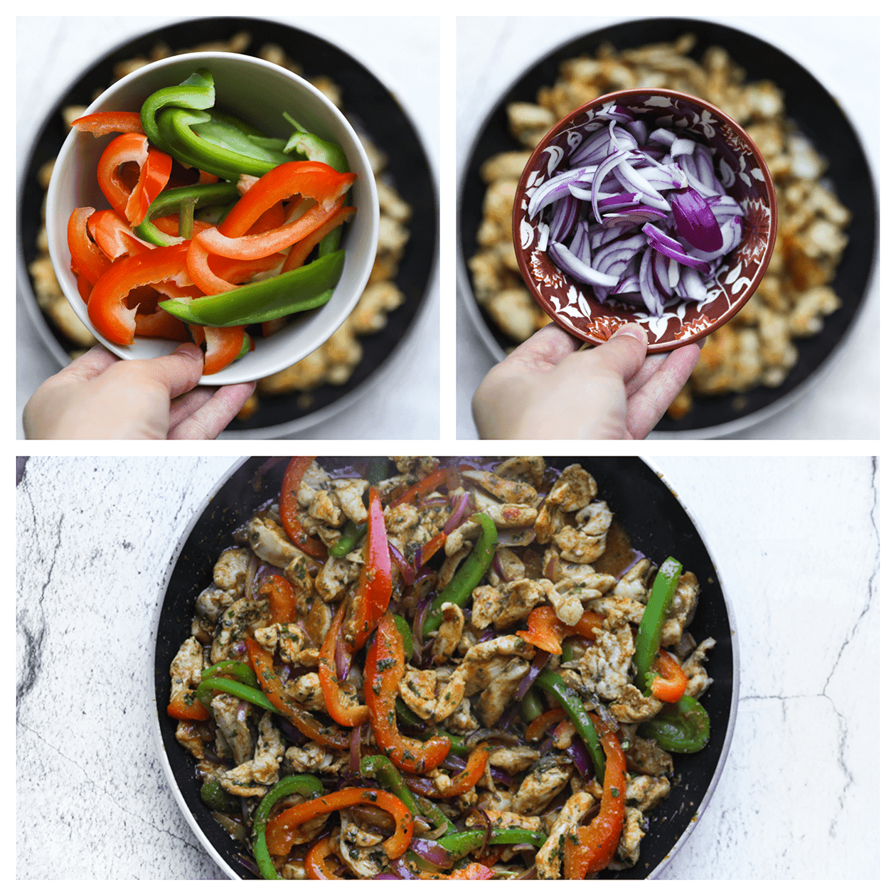 Pel en snijd de rode ui in halve ringen. Snijd de rode en groene paprika in lange slierten. Voeg de rode ui, rode paprika en groene paprika toe aan de kip. Bak deze 2-3 minuten kort mee.