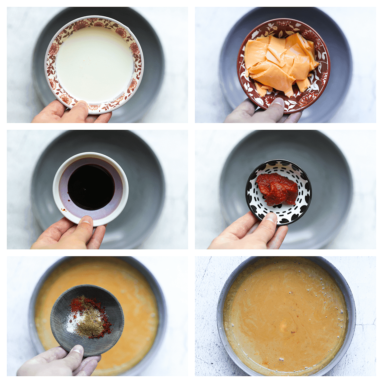 Verhit de ongeklopte slagroom in een aparte koekenpan op middelhoog vuur. Voeg de ketjap manis, tomatenpuree en cheddarkaas toe. Meng goed tot de kaas is gesmolten. Voeg het zout, cayennepeper en komijnpoeder toe. Meng goed tot een geheel.