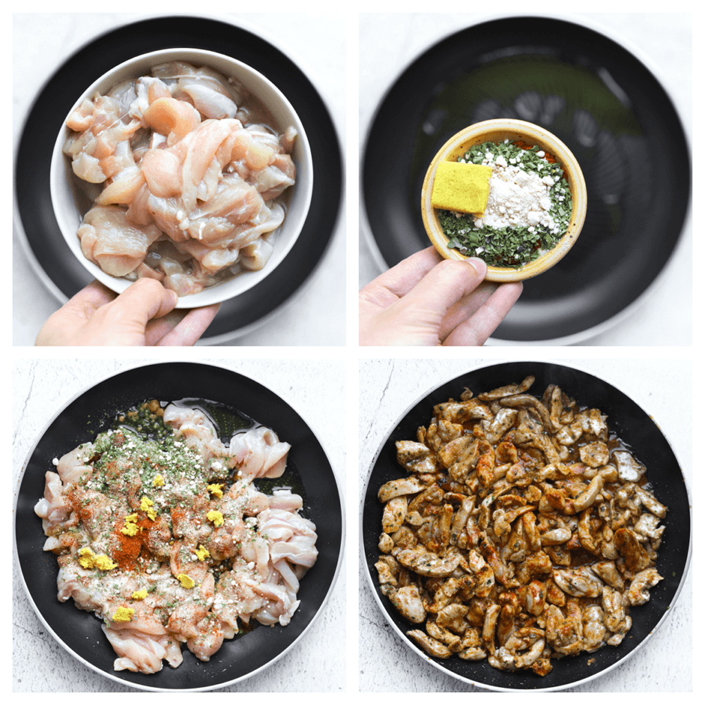 Was en snijd de kip in stukken. Verhit de olijfolie in een koekenpan op middelhoog vuur. Voeg de kip, paprikapoeder, saladekruiden, knoflookpoeder, uienpoeder, cayennepeper en komijnpoeder toe, en verkruimel het kippenbouillonblokje boven de koekenpan. Bak 4-5 minuten.