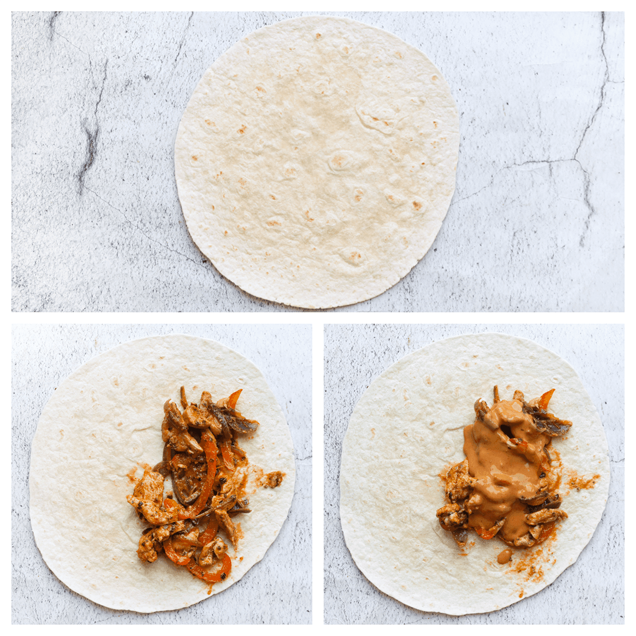 Neem een wrap en vul deze met het kipmengsel en giet er wat kaassaus over.