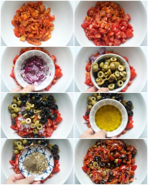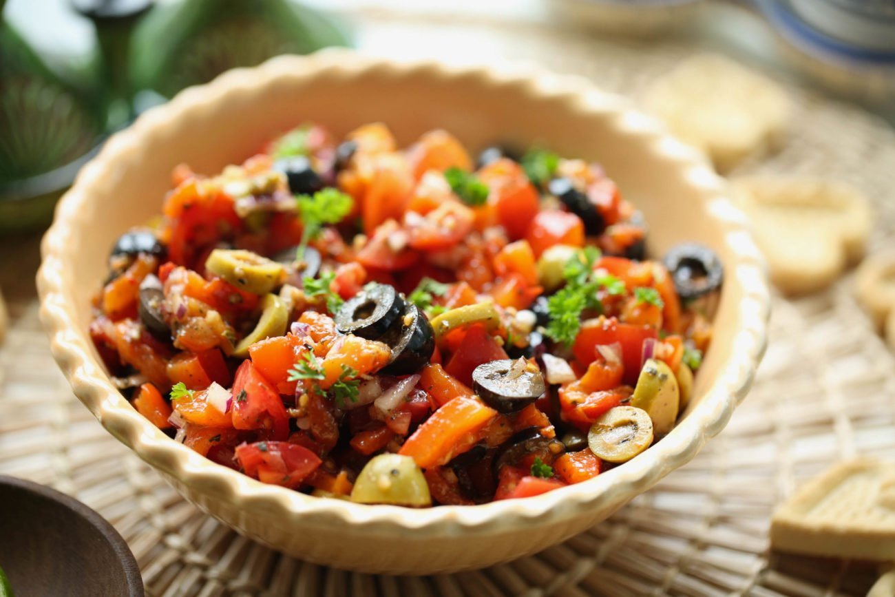 Doe de paprika, snoeptomaatjes, rode ui en olijven in een diepe kom. Meng alles samen. Voeg de olijfolie en Italiaanse kruiden toe. Meng alles samen tot een geheel. Voeg zout en peper toe naar eigen smaak.