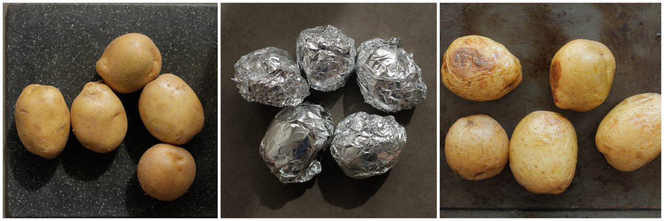 Was de grote aardappels grondig. Bestrijk elke aardappel met olijfolie. Bedek de aardappels met bakpapier en omwikkel ze vervolgens met aluminiumfolie. Plaats ze op een bakvorm met bakpapier. Bak de aardappels in een voorverwarmde oven op 200 ℃ gedurende 55-60 minuten of totdat ze zacht zijn. Prik in een aardappel om te kijken of deze gaar is. Gaat de prikker er snel doorheen, dan zijn ze gaar. |