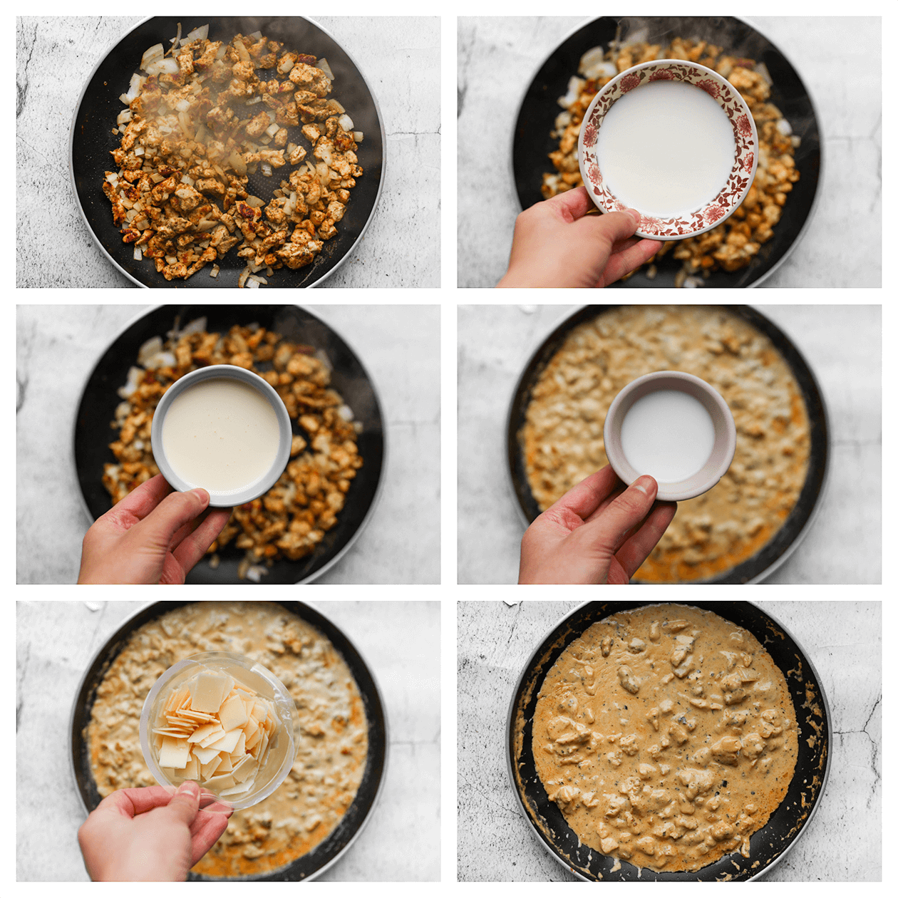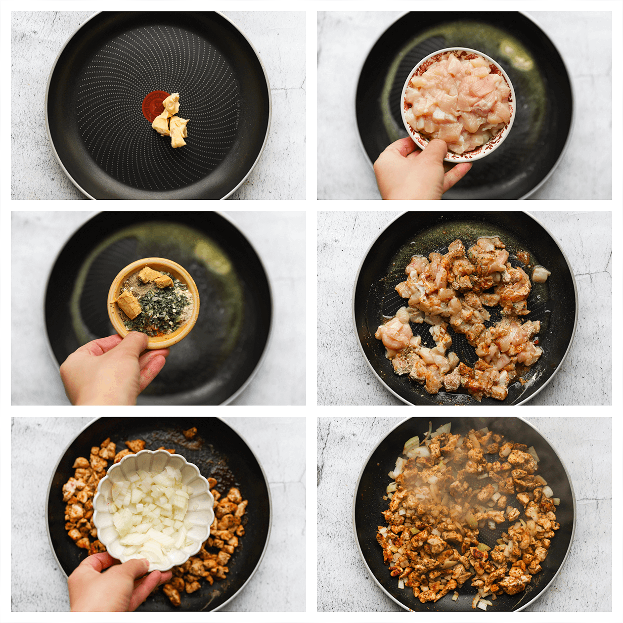 Verhit de roomboter in een koekenpan op middelhoog vuur. Voeg de stukjes kip, uienpoeder, knoflookpoeder, ras el kouzina, zwarte peper en Italiaanse kruiden toe. Verkruimel het kippenbouillonblokje boven de kip en meng goed. Bak gedurende 3-4 minuten. Voeg de gesnipperde gele ui toe en bak nog eens 3 minuten. |