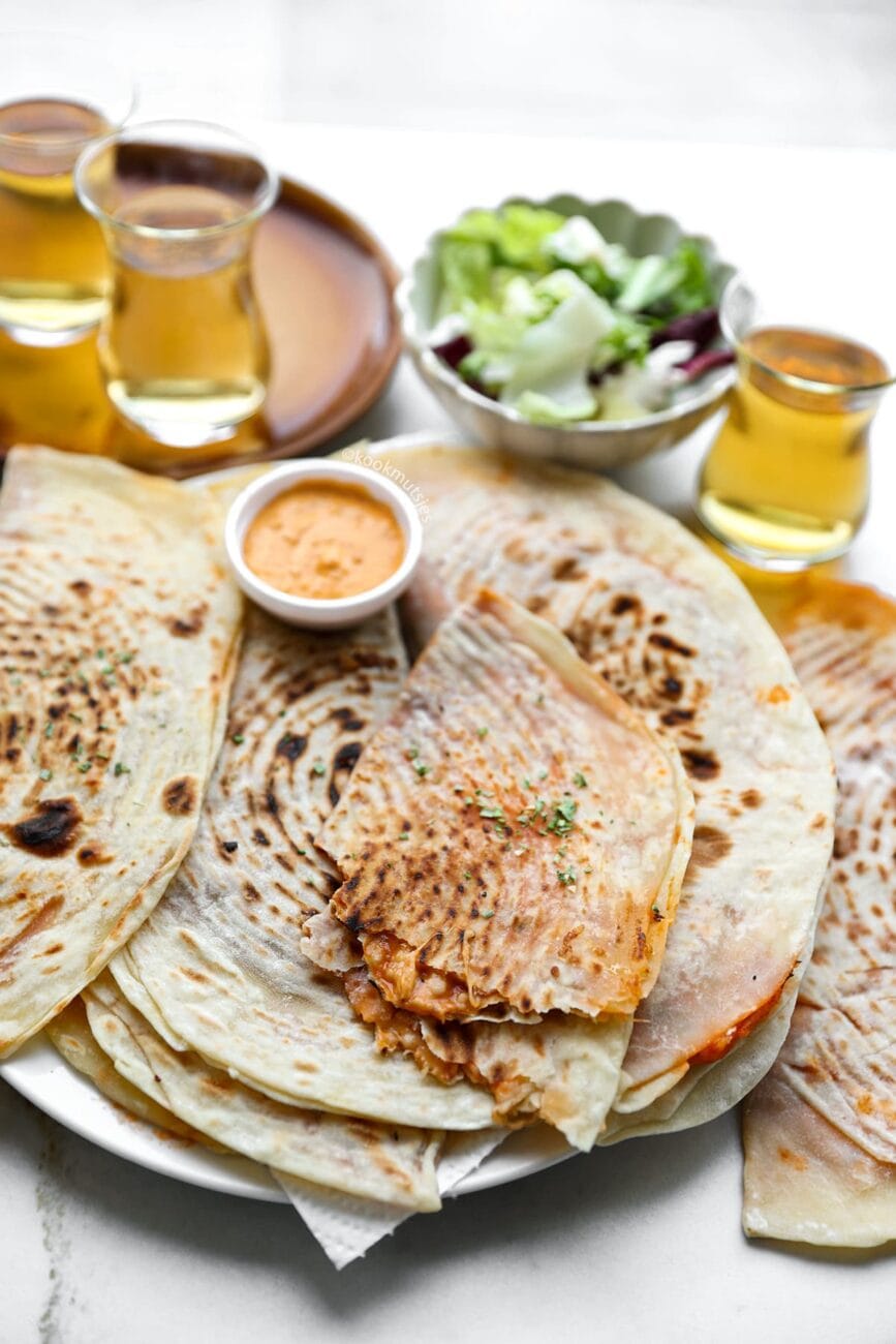 Say hello to a Turkish classic with a fun twist—these cheesy, tomato-filled gozleme are the ultimate comfort food! Imagine a soft, fluffy dough stuffed with melty cheese and a herby tomato sauce, then cooked to golden perfection in a skillet. It’s like a Turkish take on a Margherita pizza, bringing together that dreamy combo of dough, tomato, and cheese in every bite. The cream cheese in the dough makes it extra soft, and with a sprinkle of Italian seasoning, you get a cozy, comforting snack that’s simple to make and super satisfying. No oven needed, just a pan and a little time to enjoy this delicious gozleme goodness!