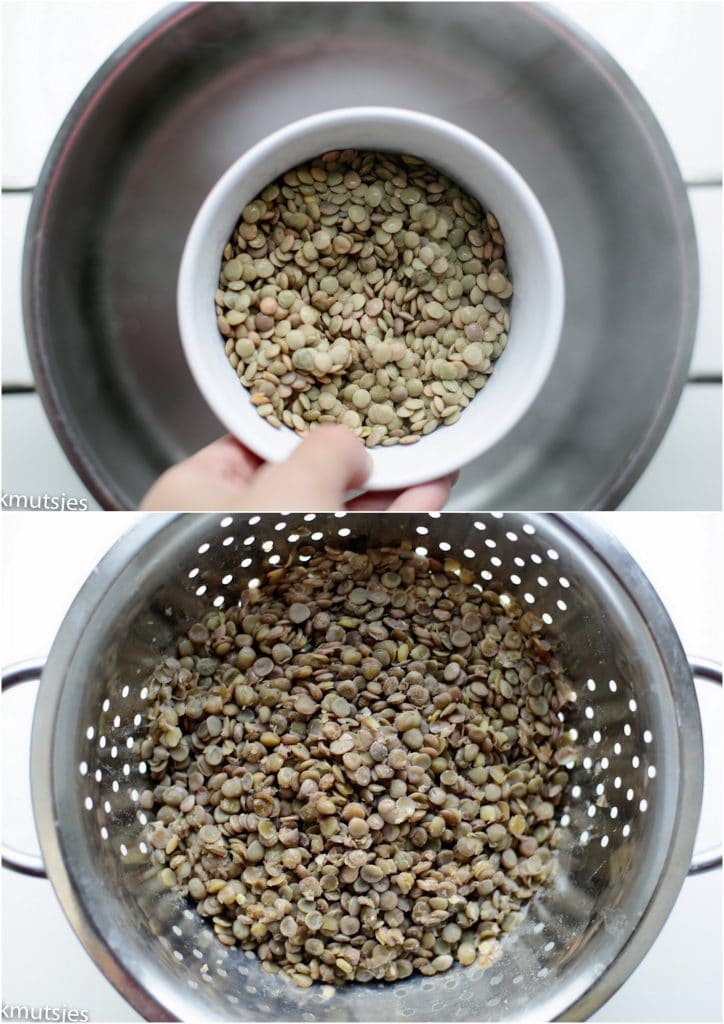 Breng een pan met water aan de kook. Als het water borrelt, voeg je de 50 gram linzen toe. Kook de linzen voor zo’n 35 tot 40 minuten of tot ze zijn. Wanneer de linzen gekookt zijn, worden ze meer dan verdubbeld in grammen (125 gram in totaal). Doe de linzen in een vergiet en spoel ze af met koud water. |