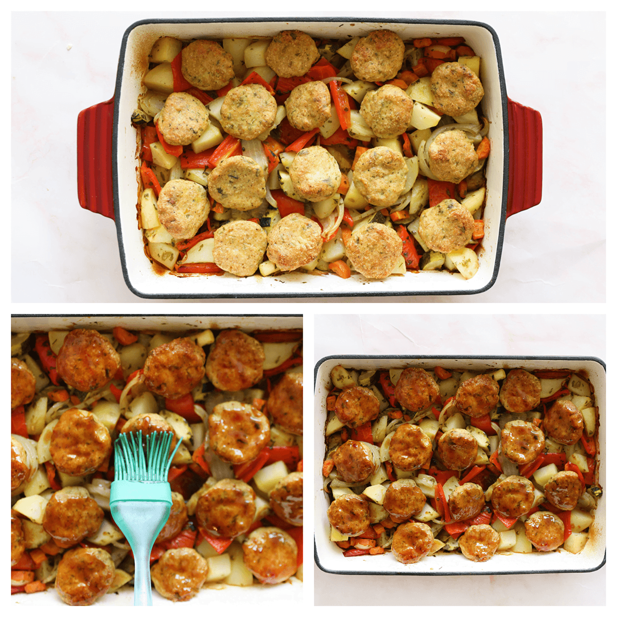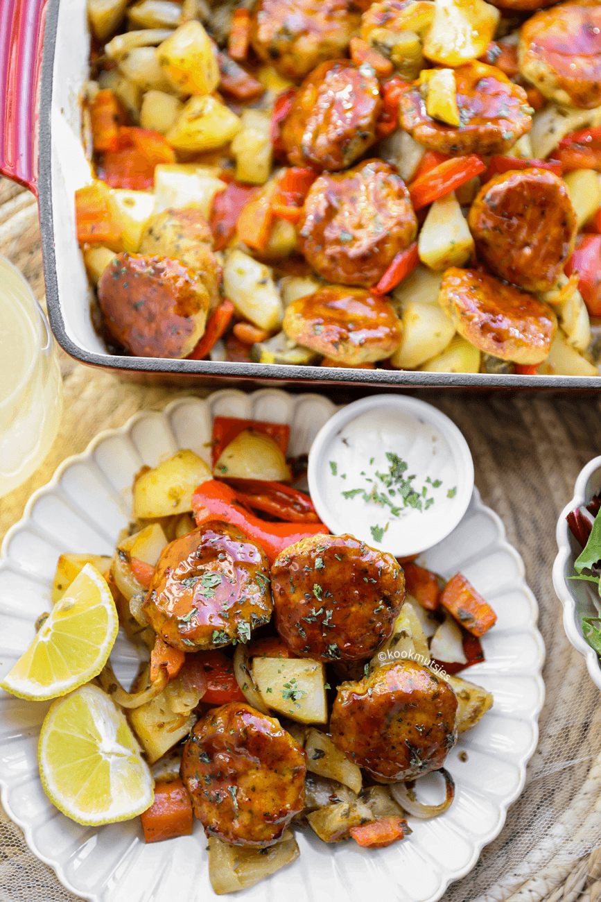 Deze sticky kipgehakt met groenten uit de oven is heerlijk! Alles wordt gebakken in de oven en is zo eenvoudig & makkelijk te maken. Perfect voor elke avond van de week!