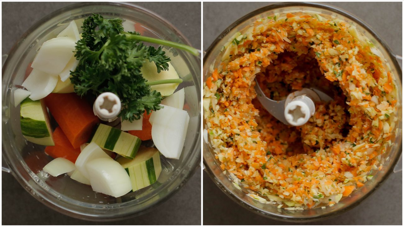 Verhit de zonnebloemolie (15 ml) in een koekenpan op middelhoog vuur. Voeg de gemalen groentes, uienpoeder, knoflookpoeder, het zout en de zwarte peper toe. Bak 3-4 minuten. Voeg de parmezaanse kaas toe en bak een minuut. Voeg het water en zonnebloemolie (40 ml) toe en kook dit weer mee voor twee minuten. |