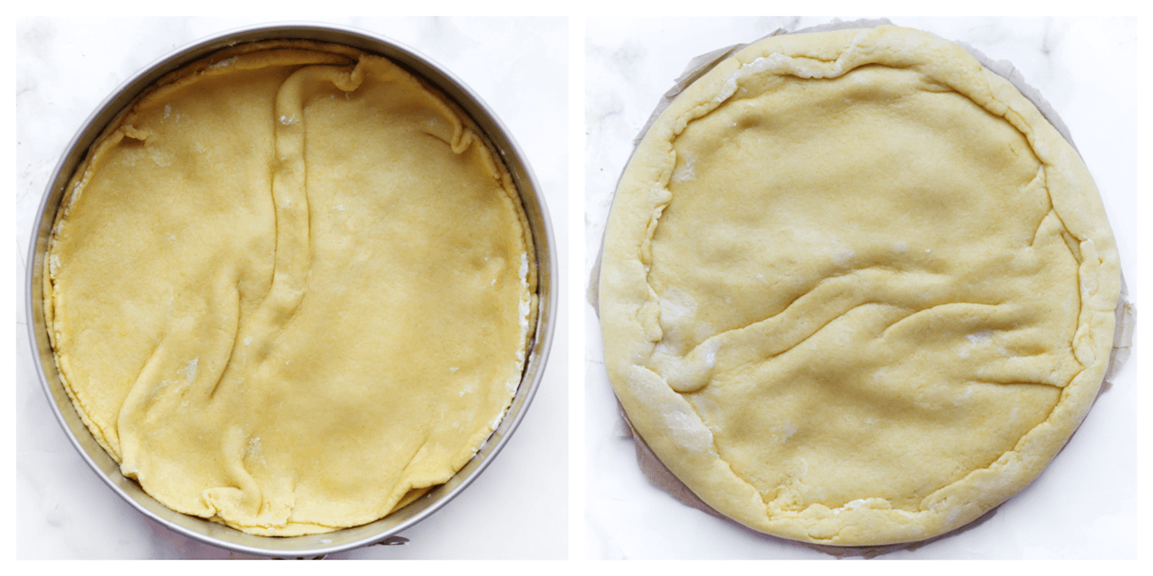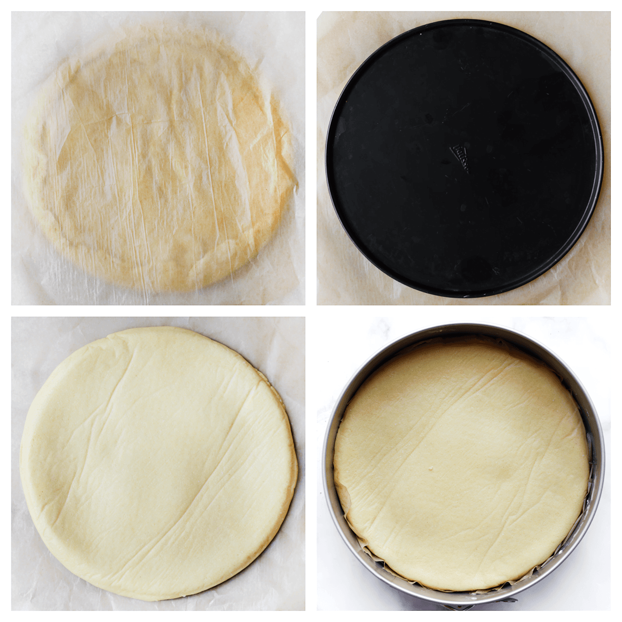 Til het deeg op met de deegroller en leg het over het roomkaasmengsel. Maak de springvorm open, haal de taart eruit en vouw de zijkanten naar binnen.