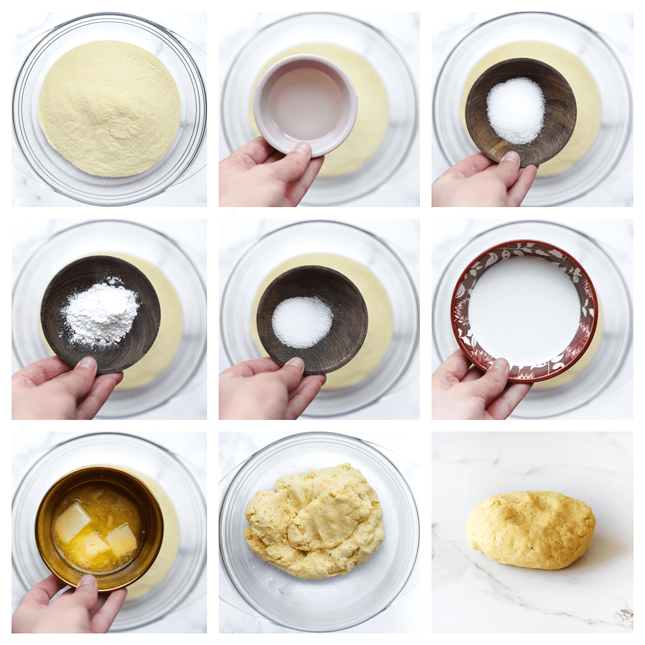 Doe de fijne griesmeel samen met de suiker, het bakpoeder, zout, zonnebloemolie, melk en gesmolten roomboter in een diepe kom. Meng goed en kneed tot een mooi geheel.