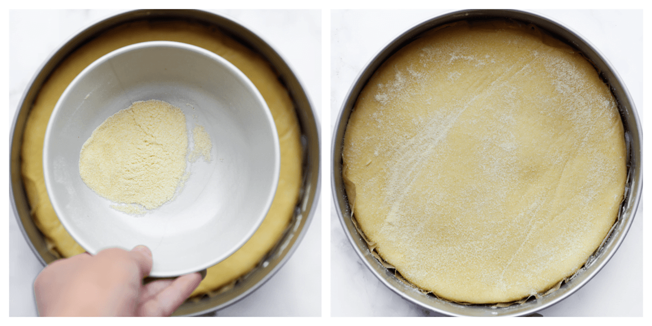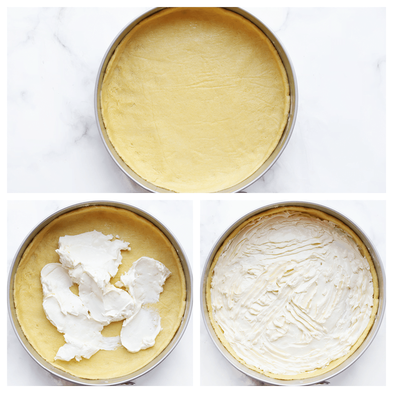 Verdeel het deeg over een springvorm en neem de zijkanten mee, met een hoogte van 3 cm. Vul deze gelijkmatig met het roomkaasvulling.