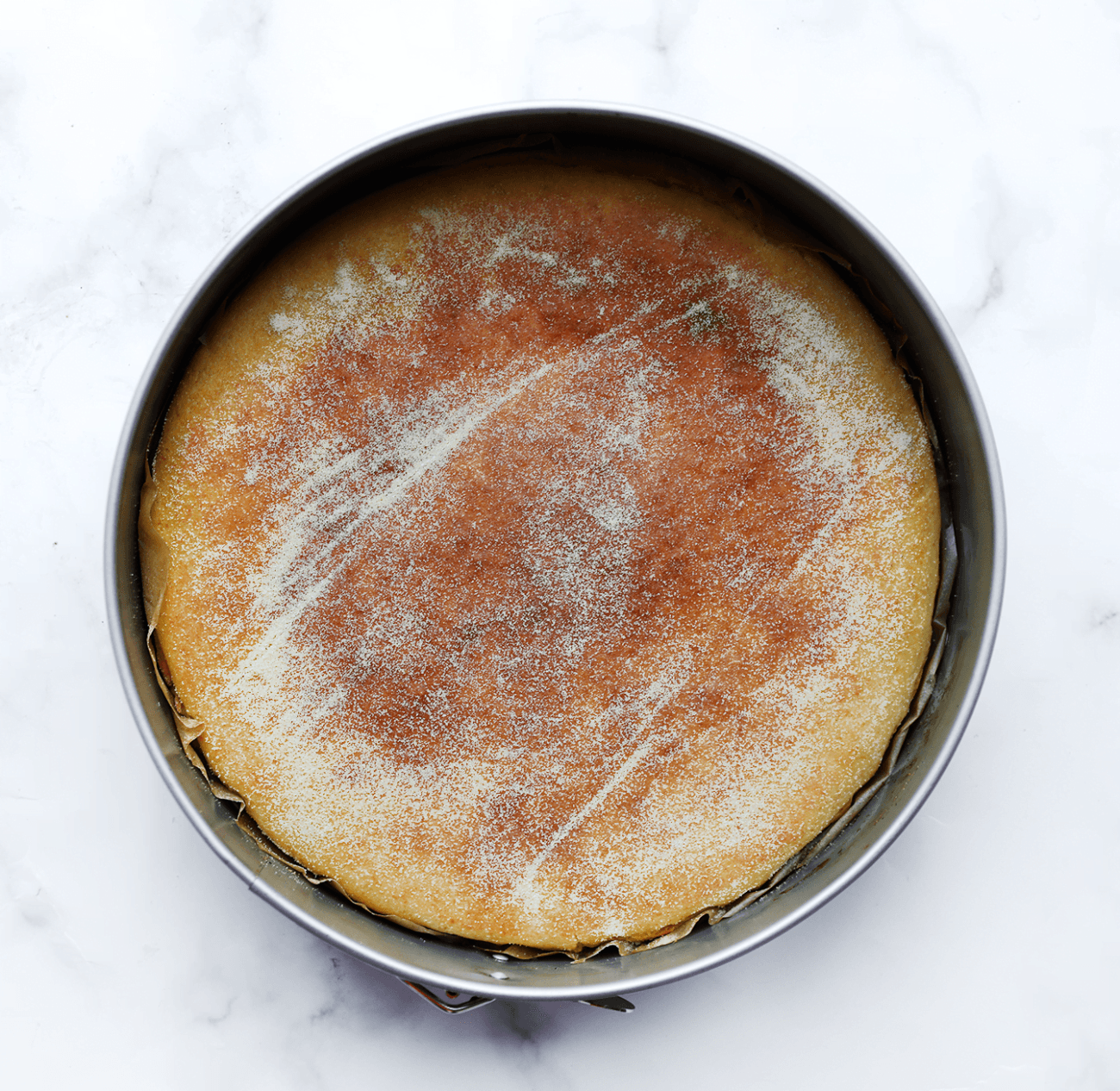 Zet de harcha-taart met roomkaasvulling in een voorverwarmde oven op 200 °C. Bak gedurende 25-30 minuten, of totdat de harcha mooi goudbruin is gekleurd. Houd de baktijd zelf in de gaten, omdat elke oven anders werkt.