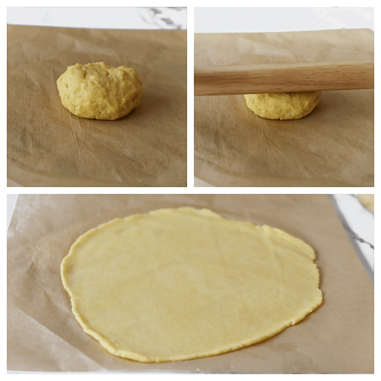 Neem een stuk deeg en leg dit op een vel bakpapier. Rol het uit tot een platte lap.