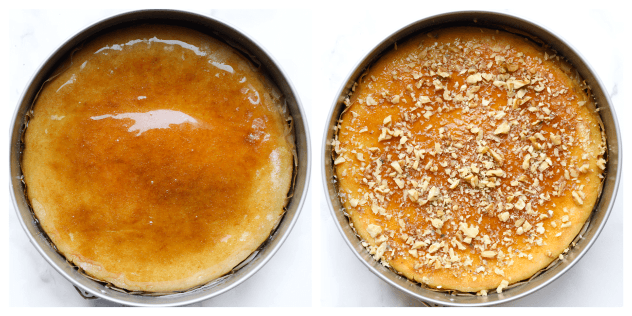 Verwarm de honing in een steelpan op laag vuur. Verdeel de honing over de harcha-taart en garneer met gehakte walnoten.